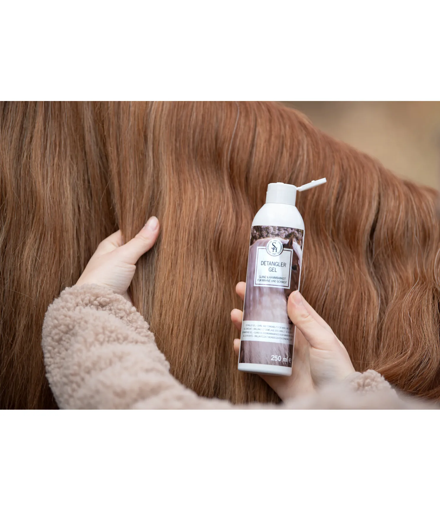 Application : Appliquer sur la paume de la main et répartir sur la crinière et la queue. Bien peigner.