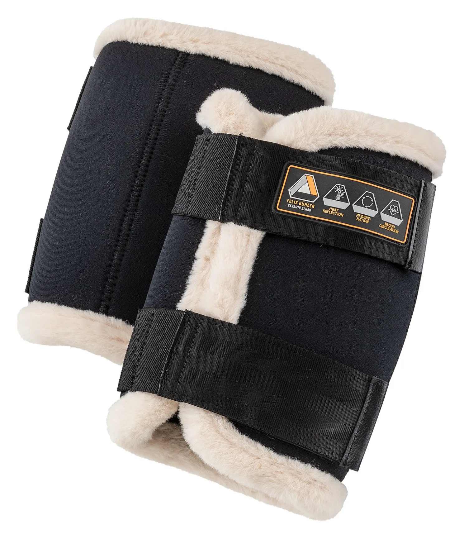 Genouillères anatomiques souples. Protection des os du carpe (genou). Doublure intérieure respirante avec fibres de céramique permettant de réfléchir la chaleur corporelle sous forme de rayonnement infrarouge et de stimuler la circulation sanguine. Idéales pour les maladies chroniques de l’articulation du carpe comme l’arthrose. En cas d’inflammation aiguë des glandes séreuses, la chaleur peut aggraver le processus inflammatoire, c’est pourquoi nous recommandons dans tous les cas de demander l’avis d’un vétérinaire avant utilisation ! Peuvent également servir de protection contre les blessures en cas de pseudo-narcolepsie. Doublure douce et moelleuse en polaire Teddy pour protéger des irritations dues aux frottements, même en cas de port prolongé. Pour cela, elles doivent être nettoyées régulièrement. Les protections sont lavables en machine à 30 degrés sur cycle délicat. Deux larges pattes auto-agrippantes robustes avec insert élastique pour un maintien sûr et ajustement individuel de la taille. Vendues par paire ! Matière extérieure 100 % caoutchouc chloroprène, doublure intérieure et polaire 100 % polyester.