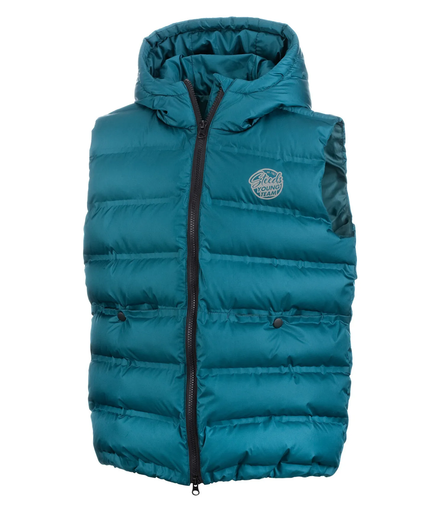 Gilet d’équitation matelassé sportswear avec col montant et capuche. Fermeture à glissière de couleur contrastante avec protège-menton. 2 poches avant avec boutons-pression. Ourlet élastiqué. Imprimé STEEDS réfléchissant sur la poitrine. Surpiqûres thermosoudées. 100 % polyester.