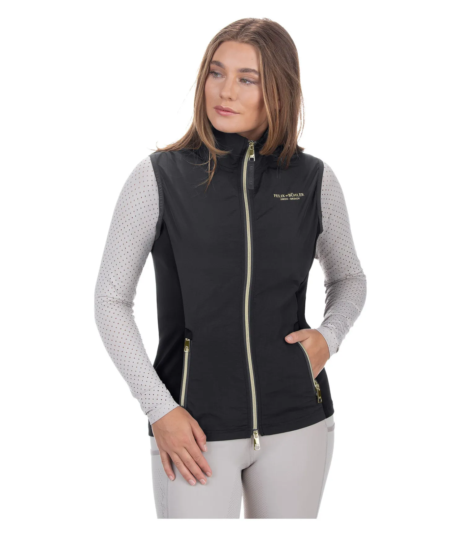 Gilet d’équitation léger et élégant en nylon. Coupe-vent. Les côtés en stretch permettent une grande liberté de mouvement et un ajustement parfait. Col montant. Fermeture à glissière double sens avec sous-patte. Deux poches latérales zippées. Broderie Felix Bühler sur la poitrine. 100 % nylon ; stretch 95 % polyester, 5% élasthanne.