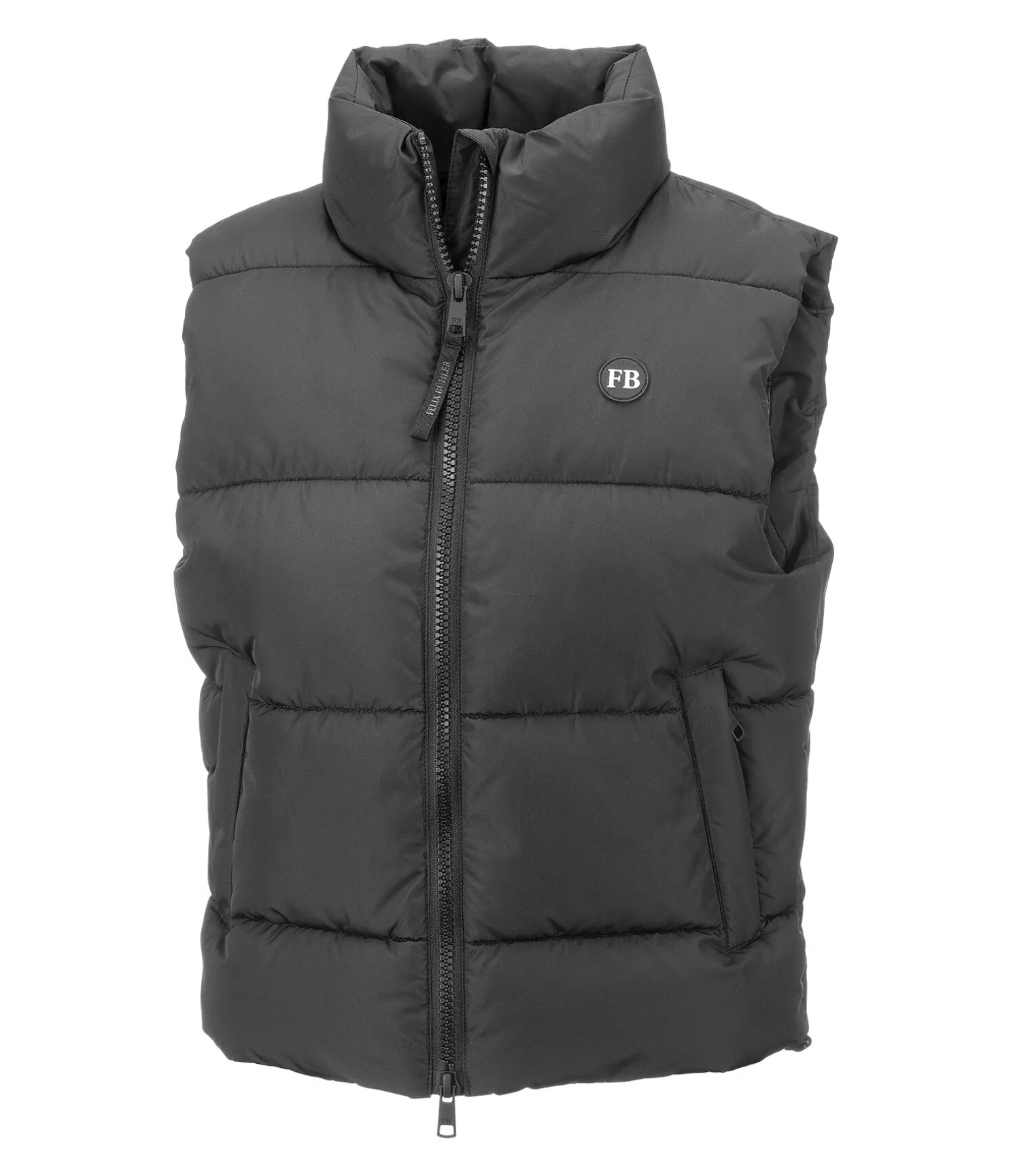 Gilet d’équitation tendance cropped et matelassé avec col montant et garnissage imitation duvet. Fermeture à glissière double sens avec sous-patte et protège-menton. 2 poches avant zippées et dissimulées. Badge Felix Bühler sur la poitrine. Taille ajustable par cordons élastiqués. 100 % polyester.