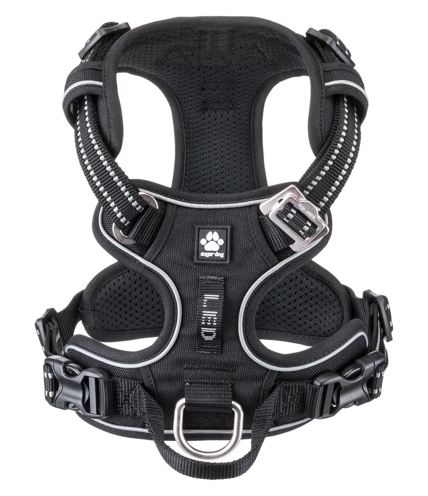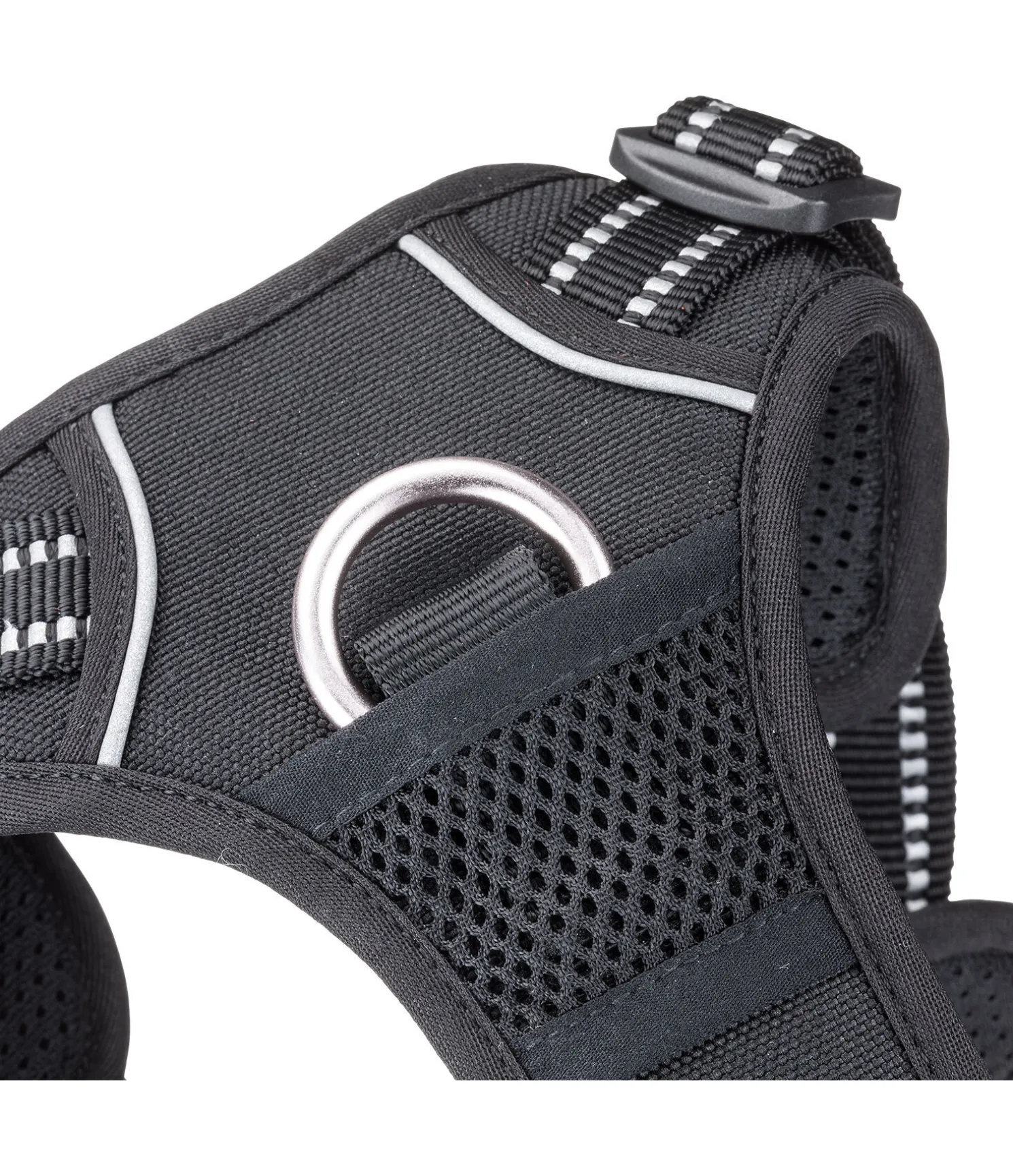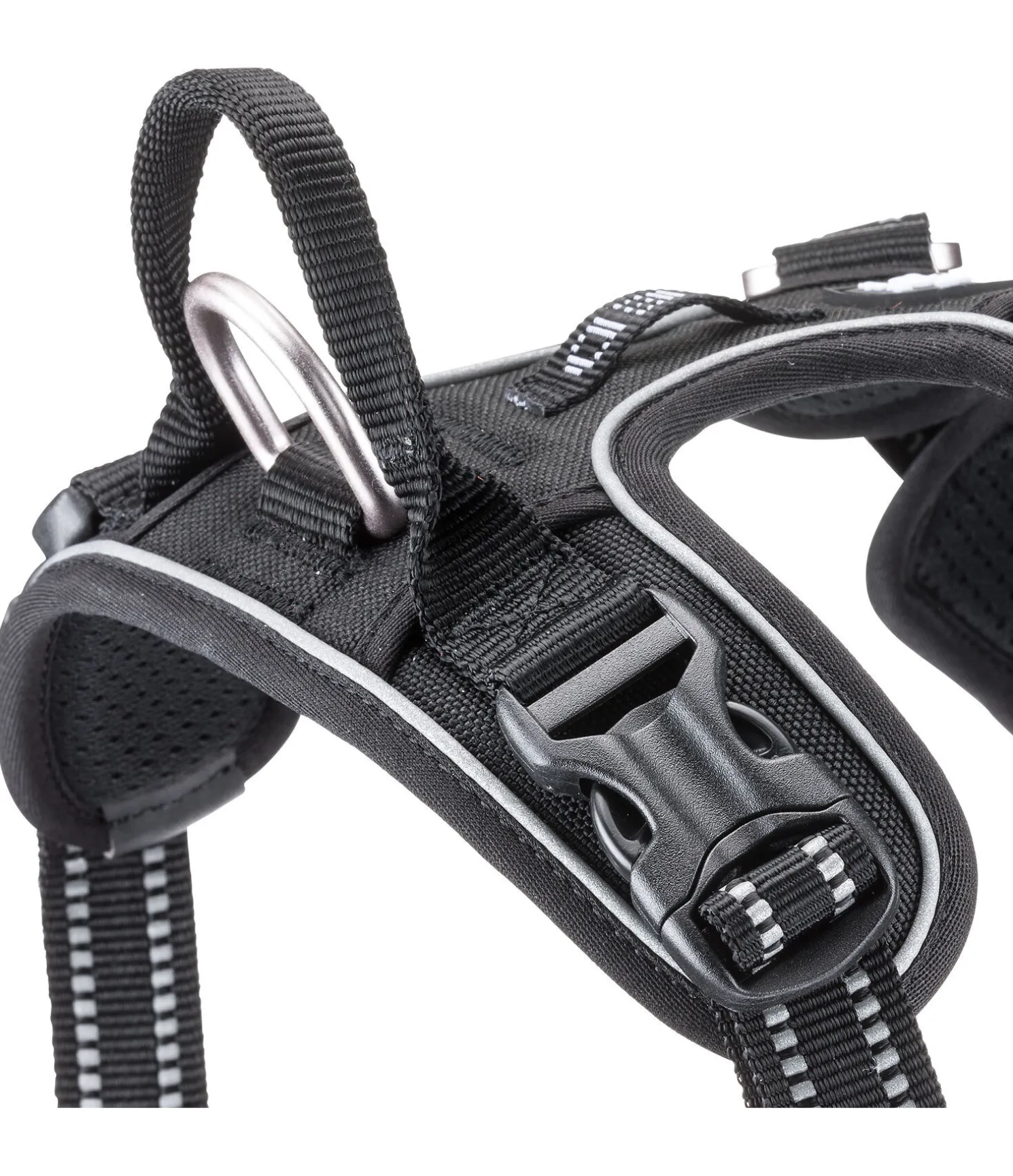 Harnais ultra robuste. Idéal pour le quotidien ou pour partir en expédition. Les solides sangles en nylon comportent de nombreux éléments réfléchissants pour plus de sécurité dans l’obscurité. Le rembourrage intérieur en mesh respirant assure un confort optimal. La sangle en nylon sur le poitrail et sur le dos est réglable sur chaque côté pour que le harnais s’adapte parfaitement à la morphologie du chien ! Les deux fermetures à clip robustes Duraflex® peuvent supporter jusqu’à 50 kg, selon la taille du harnais choisie. La boucle en aluminium sur la sangle avant droite permet d’ouvrir le harnais sur un côté pour un enfilage facile. Petite poignée sur la sangle dorsale pour garder le chien au pied. Boucle pour fixer un pendentif LED (réf. 600 010) ou un médaillon. La laisse peut être fixée à l’anneau en D sur le dos ou à l’anneau classique sur le poitrail. L’anneau classique est protégé par un filet extensible, utile pour les entraînements lorsque le chien tire en laisse. Harnais 100 % polyester, lanières 100 % nylon.
