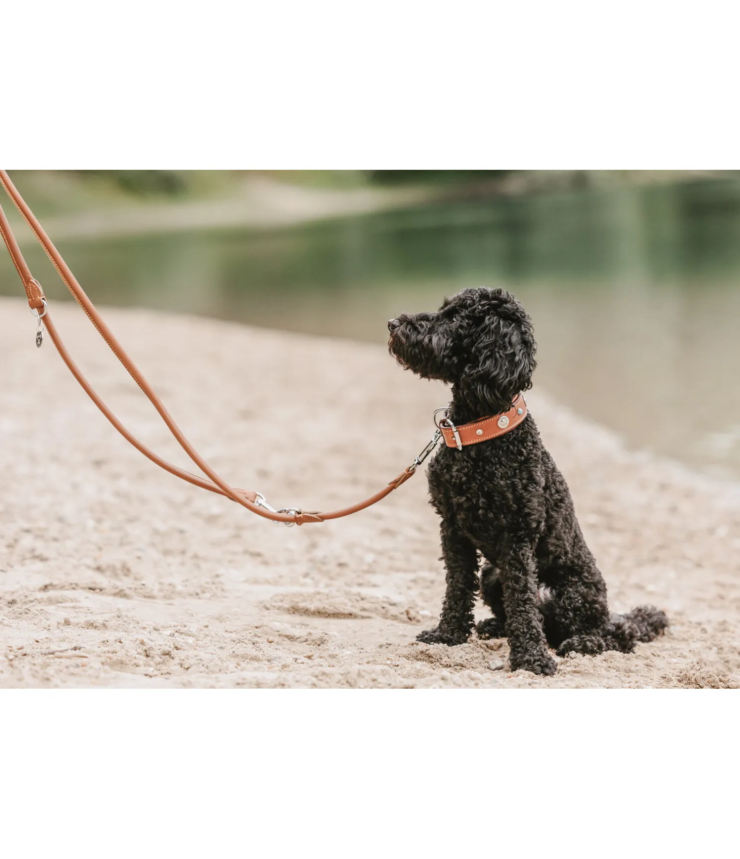 Laisse ronde en cuir véritable. Toucher doux. Longueur réglable sur 3 positions grâce à 3 anneaux et 1 mousqueton. Bouclerie rose doré dans la couleur BS et argentée dans la couleur BR et TB. Petit médaillon avec logo.