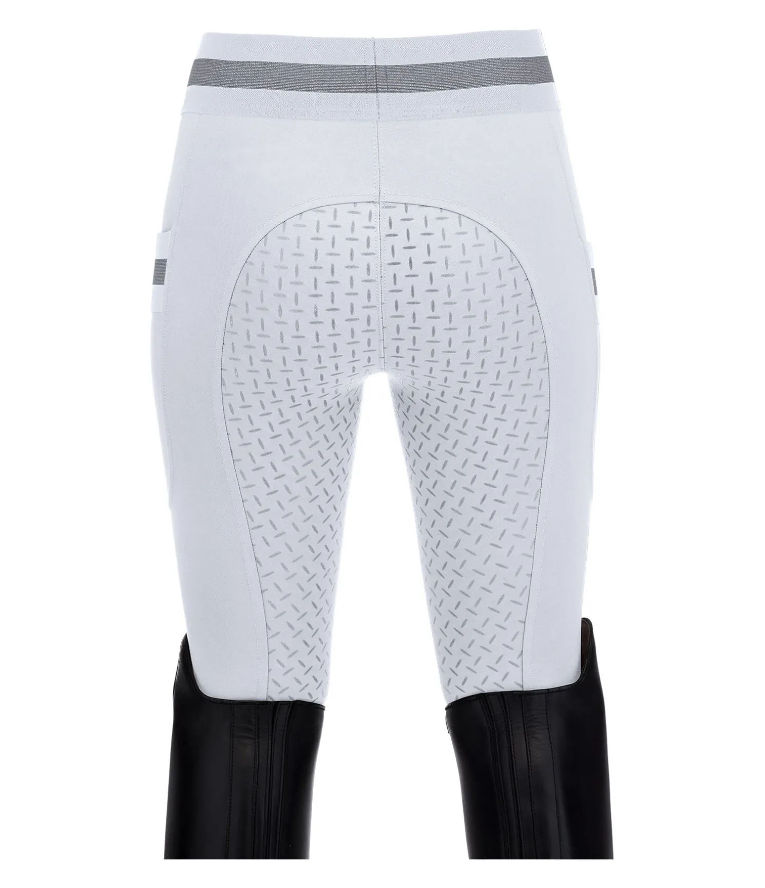 Legging d’équitation sportswear. Matière respirante et très confortable. Fond intégral en silicone. Matière stretch de grande qualité extensible dans 4 directions. Ceinture élastiquée pailletée. Poche pour téléphone portable sur la cuisse. Bas de jambe extensible sans patte auto-agrippante. 68 % viscose, 27 % polyamide, 5 % élasthanne.