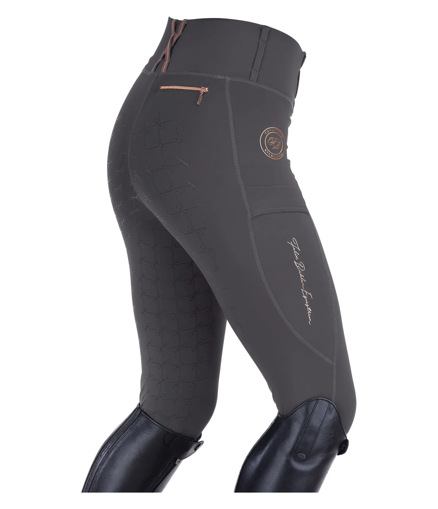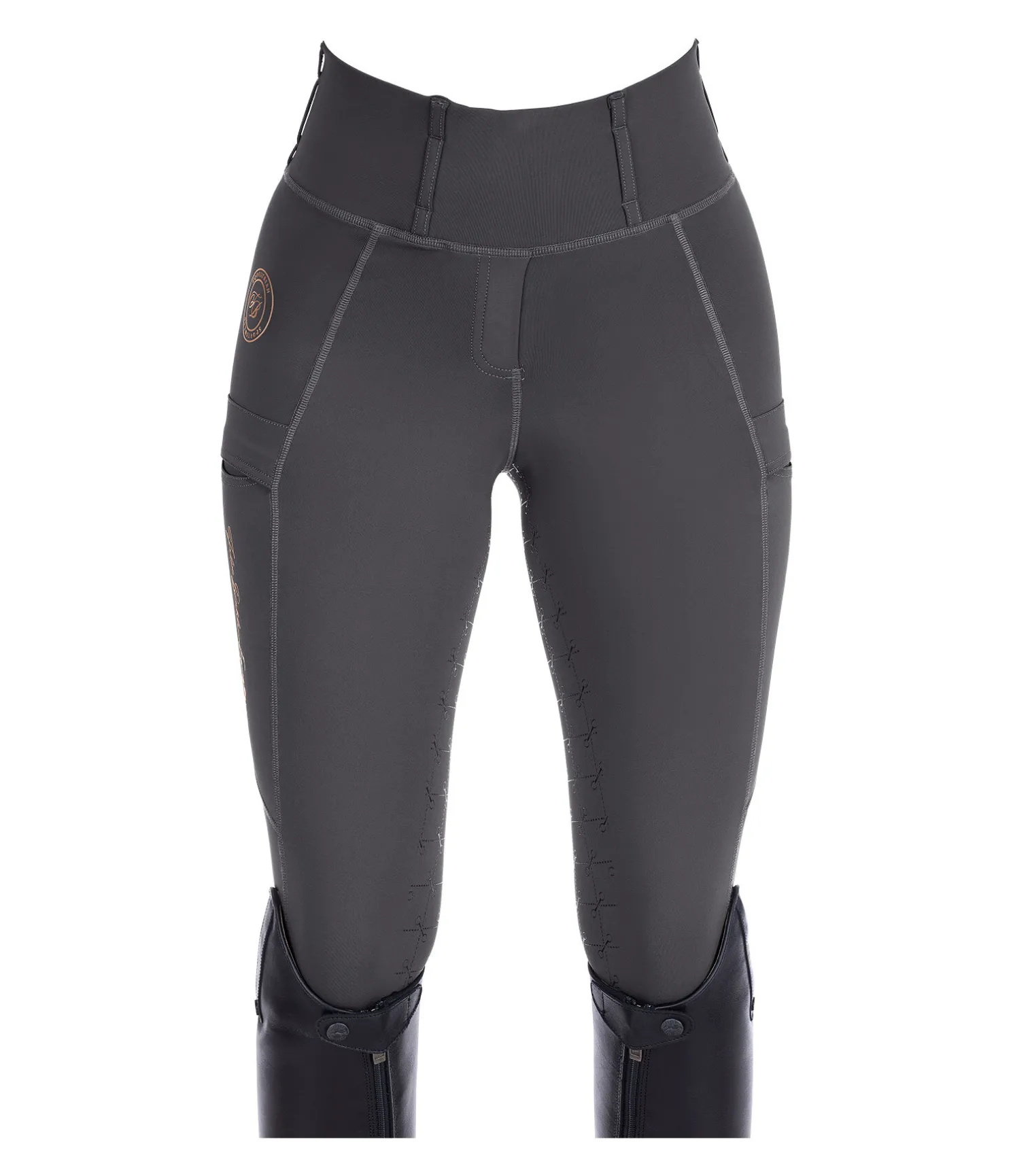Legging d’équitation confortable à fond intégral grip en silicone avec motifs de mors. Matière respirante de grande qualité, extensible dans 4 directions. Séchage rapide. Soutien parfait et coupe ajustée. Ceinture extra large avec passants. 1 poche arrière zippée et 2 poches latérales pour téléphone portable. Aucune couture au niveau des genoux. Bas de jambe extensible. Imprimés Felix Bühler pailletés. 78 % polyester, 22 % élasthanne.