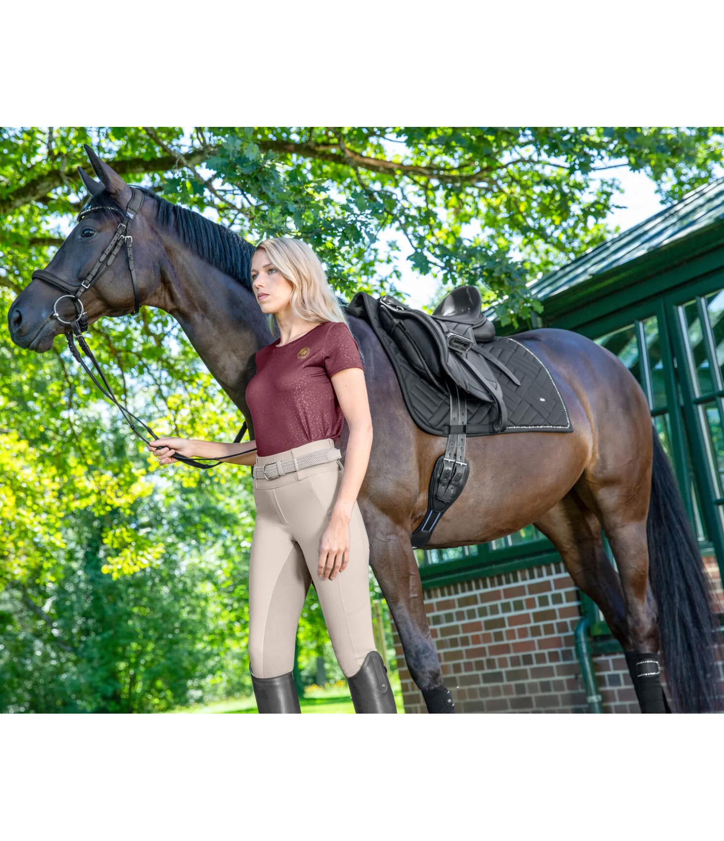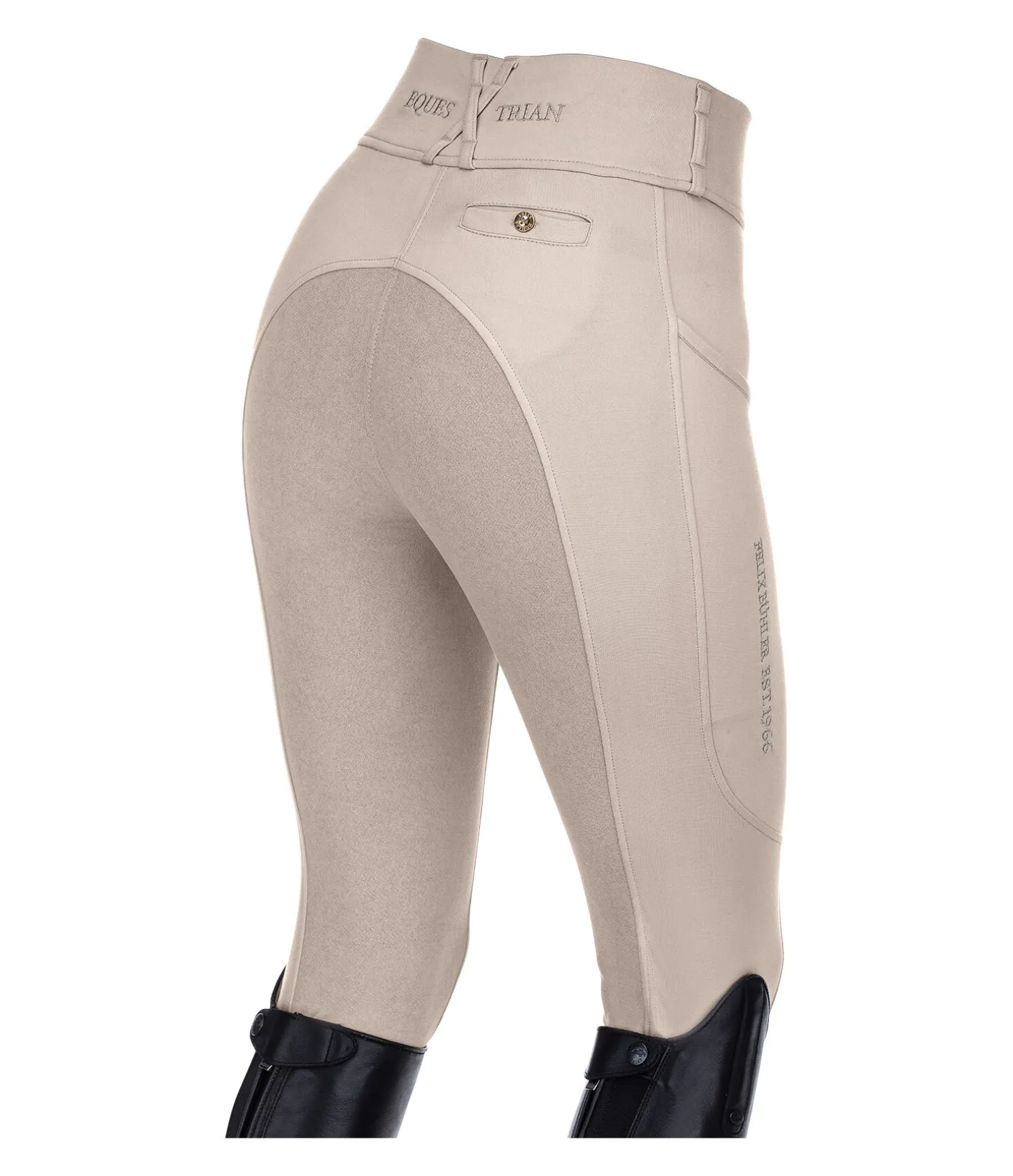 Joli legging d’équitation. Fond intégral en synthétique. Matière stretch très confortable et extensible dans 4 directions. Broderie Felix Bühler sur la jambe et à l’arrière. Ceinture extra large avec passants. Deux poches pour téléphone portable sur la cuisse et une petite poche arrière. Bas de jambe extensible. 68 % viscose, 27 % polyamide, 5 % élasthanne.