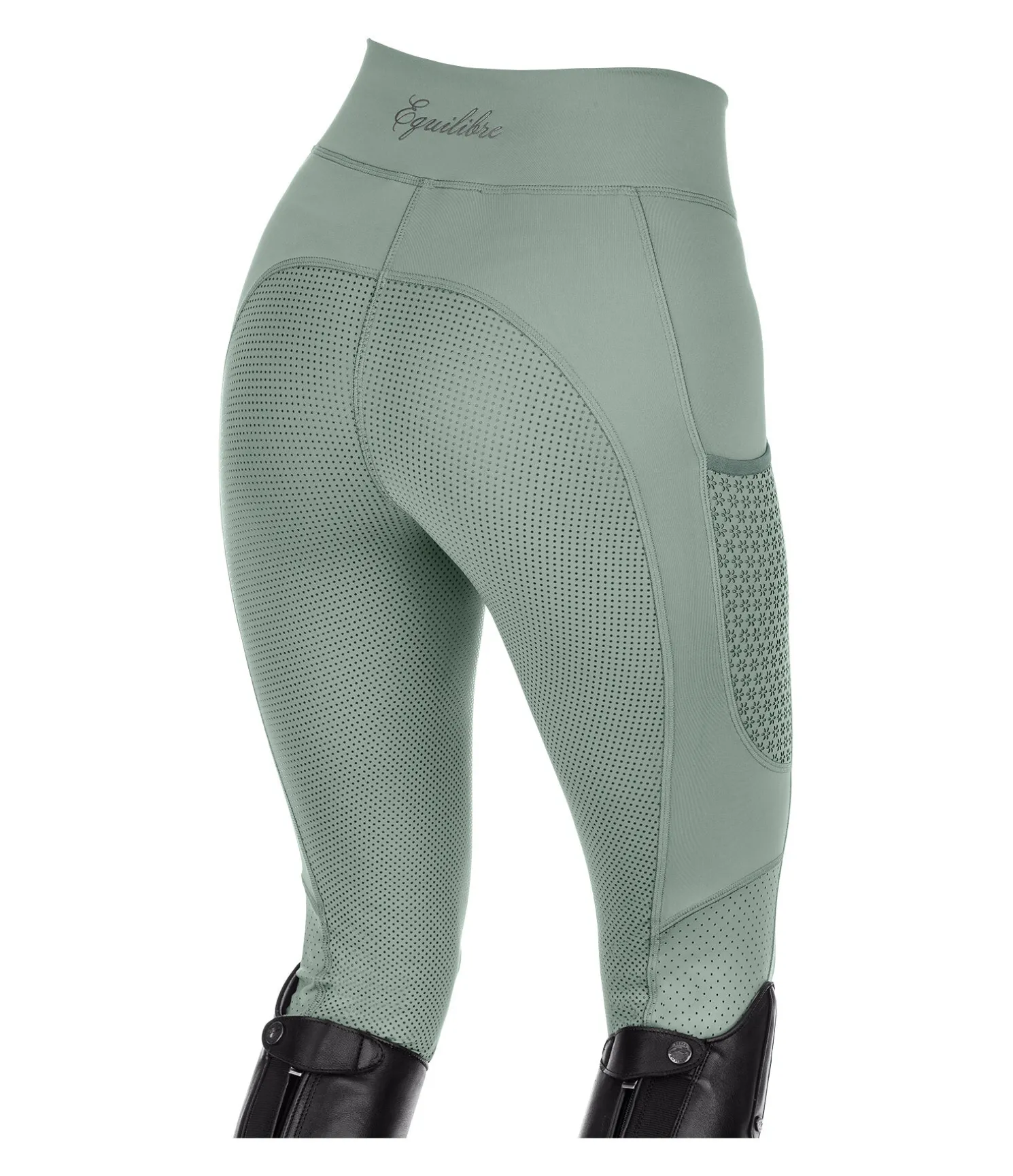 Legging d’équitation confortable à fond intégral grip en silicone. Stretch extensible dans 4 directions pour un effet sculptant garanti. Matière respirante à séchage rapide. Empiècements ajourés sur la jambe, grâce à une découpe laser, avec motif de petite fleur. Ceinture large avec passants. Une poche sur la jambe pour téléphone portable. Aucune couture sur les genoux. Signature Equilibre discrète à l’arrière. 82 % polyester, 18 % élasthanne.