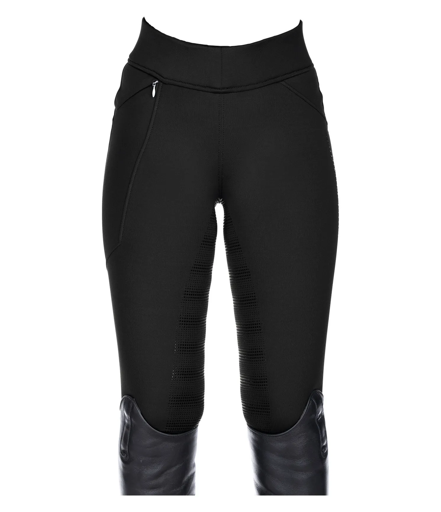 Legging d’équitation thermique ultra confortable. Taille haute. Fond intégral grip en silicone. Matière stretch douce et respirante. Séchage rapide. Poche latérale zippée pour téléphone portable. Logo brodé à l’arrière. 86 % polyester, 14 % élasthanne.