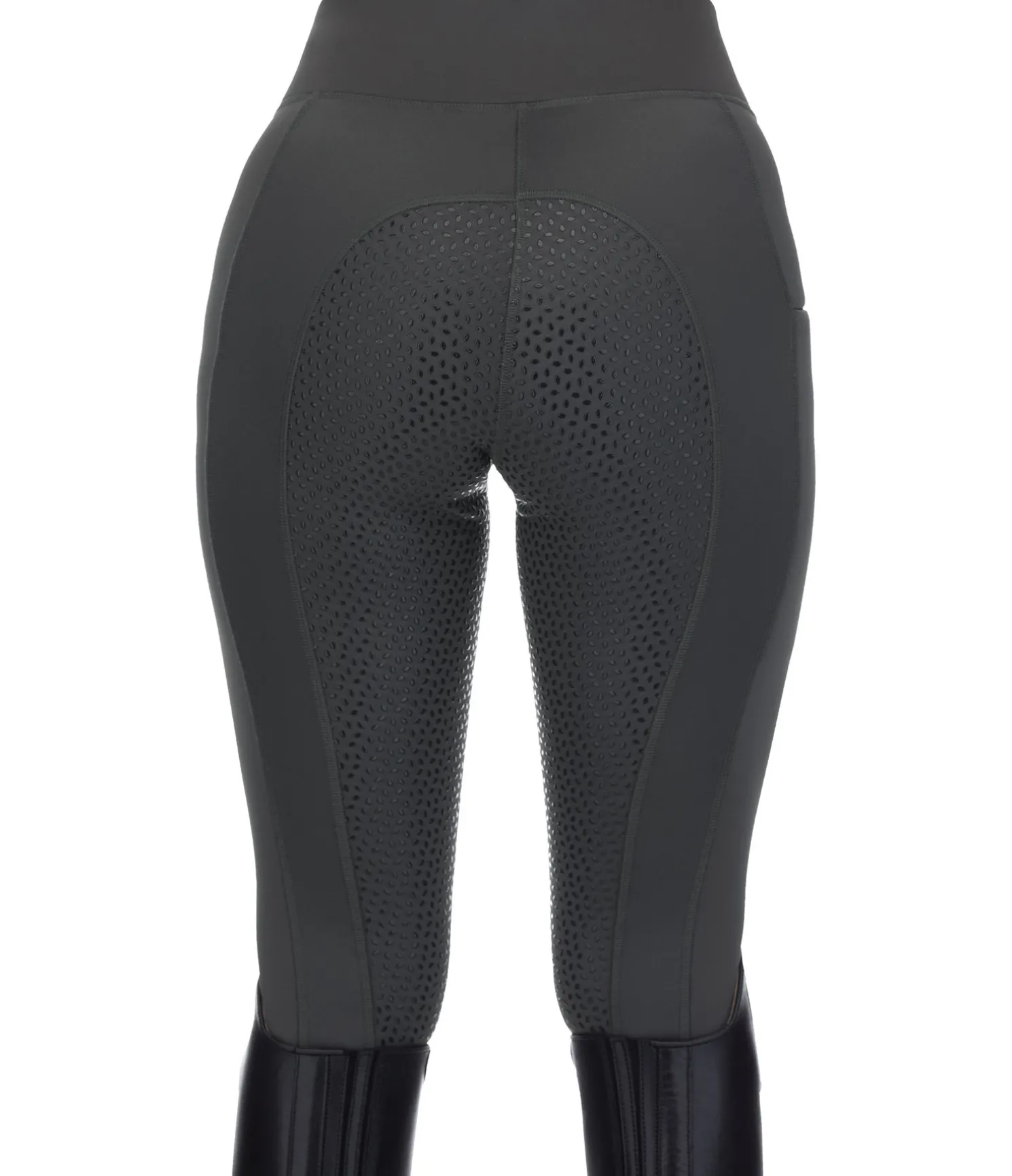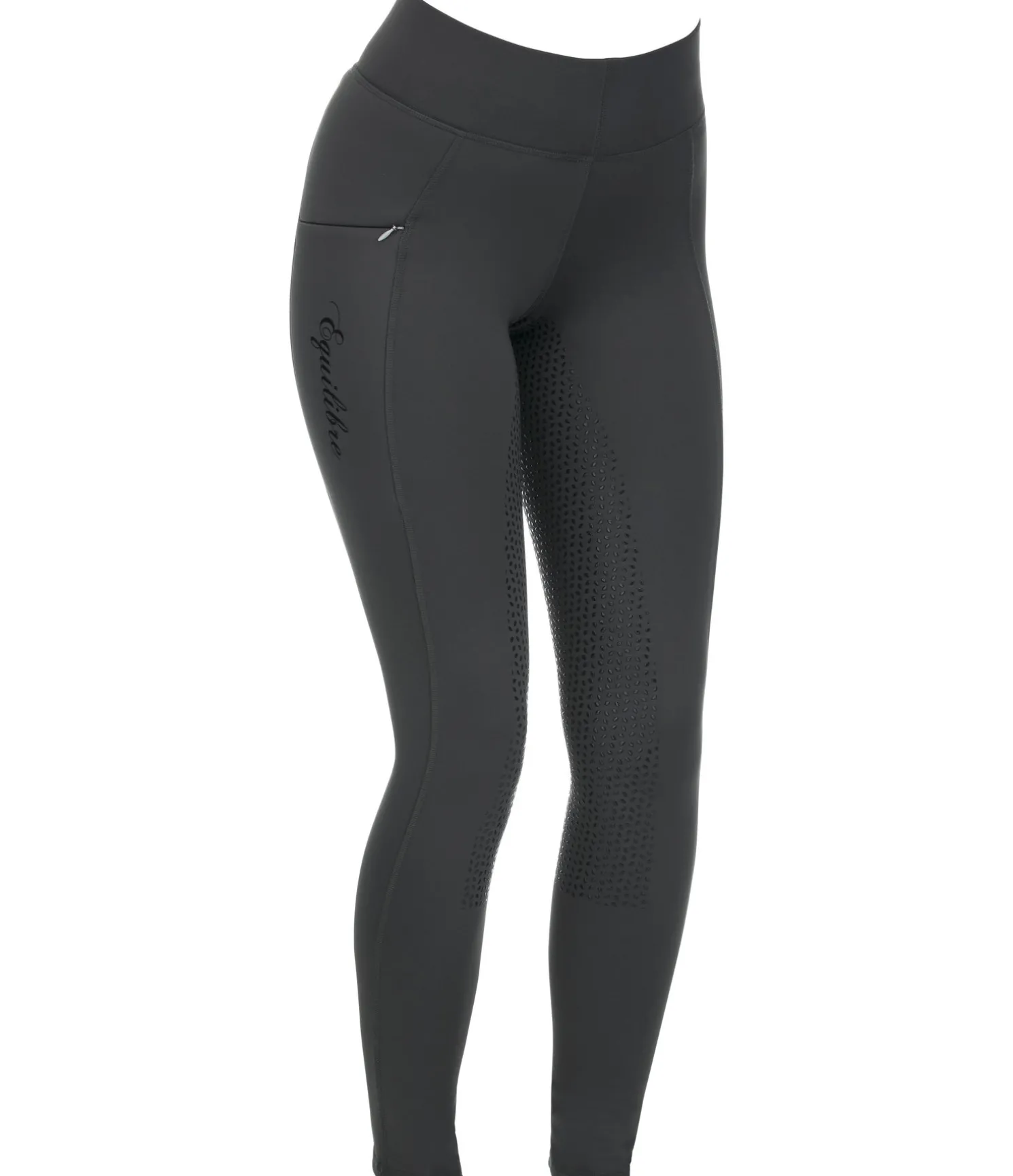 Legging d’équitation extensible avec fond intégral grip en silicone. Extérieur lisse et intérieur molletonné. Ceinture extra large élastiquée. Poche zippée pour téléphone portable sur la cuisse. Bas de jambe extensible sans patte auto-agrippante. 86 % polyester, 14 % élasthanne.