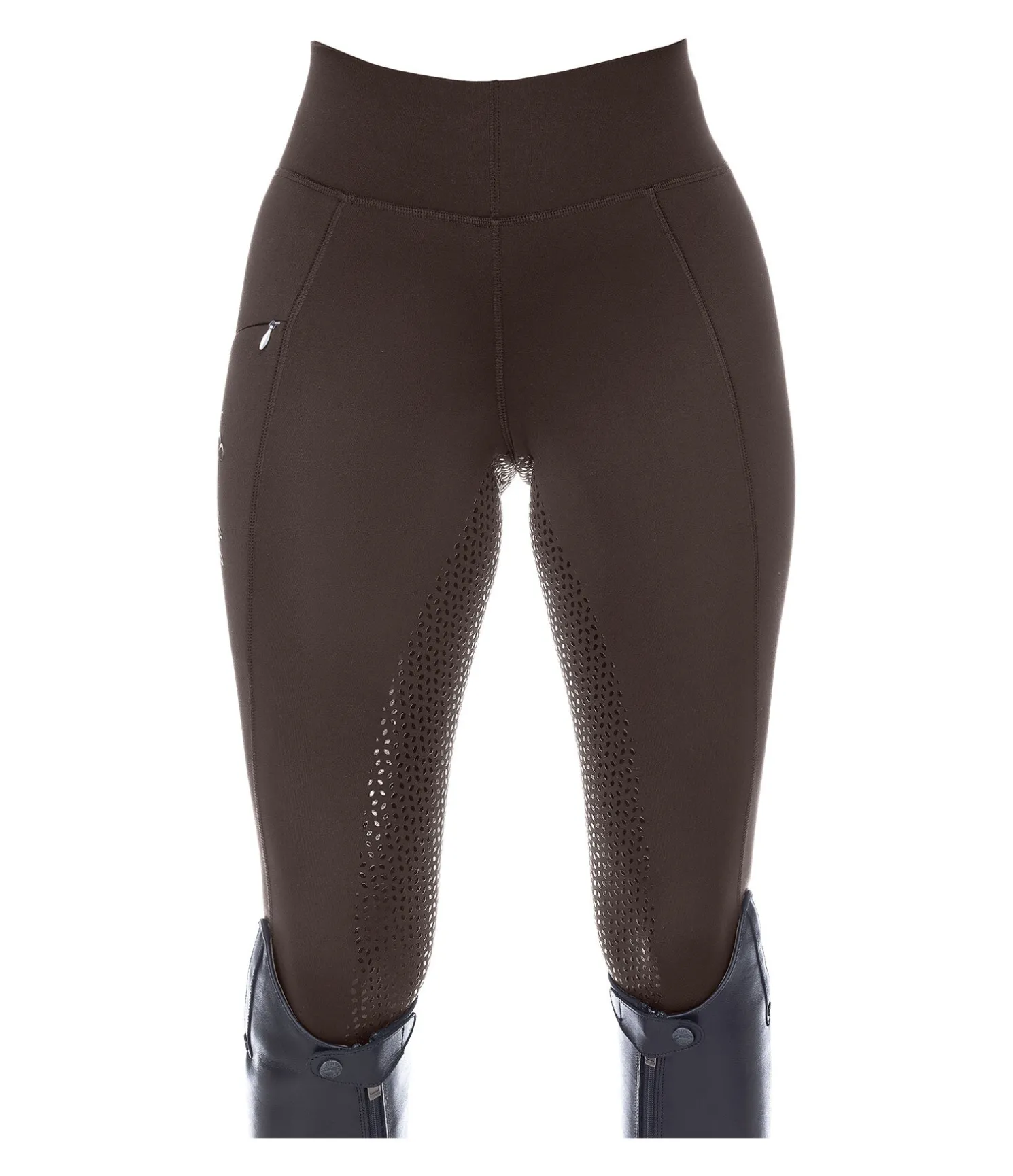 Legging d’équitation extensible avec fond intégral grip en silicone. Extérieur lisse et intérieur molletonné. Ceinture extra large élastiquée. Poche zippée pour téléphone portable sur la cuisse. Bas de jambe extensible sans patte auto-agrippante. 86 % polyester, 14 % élasthanne.