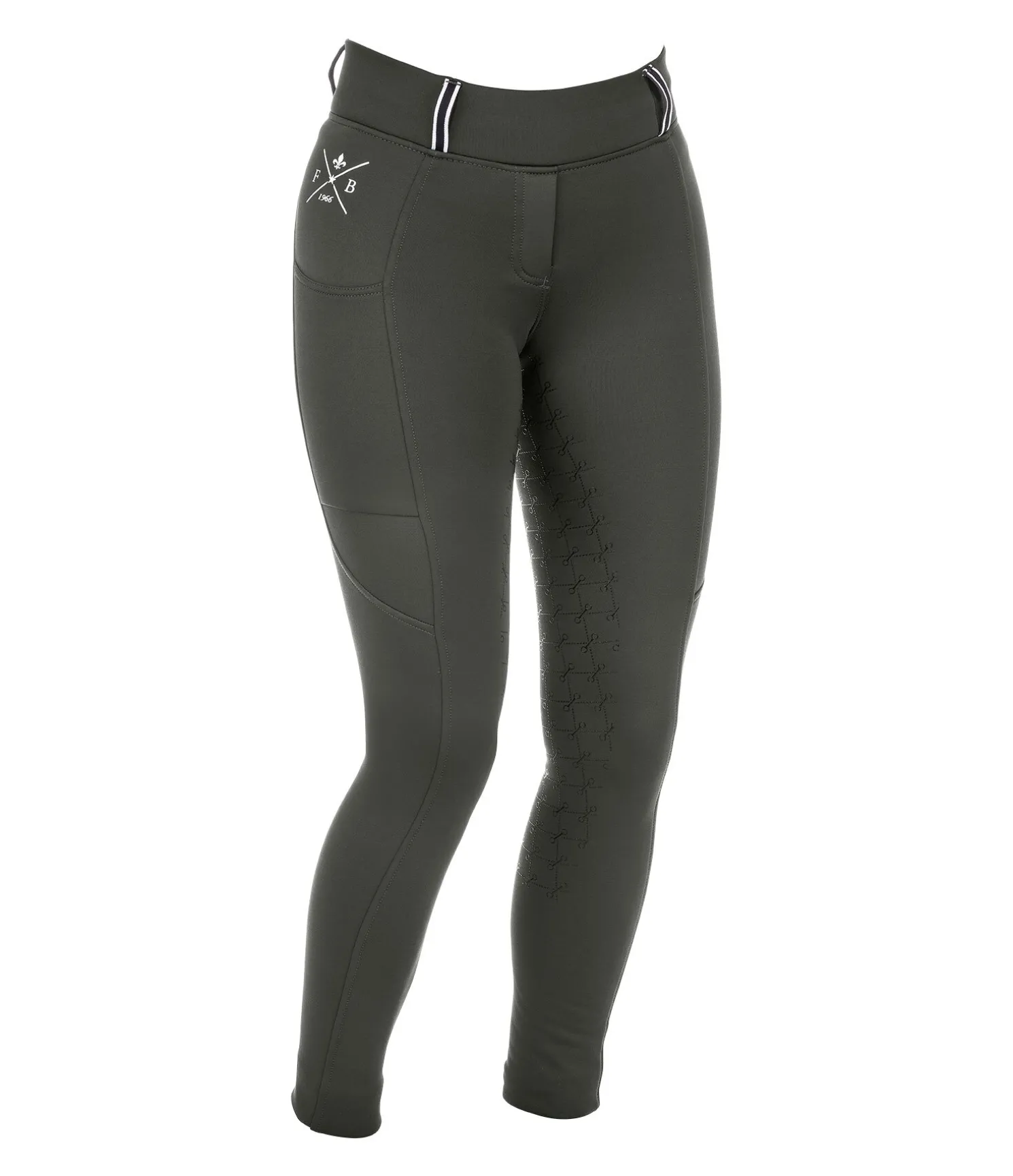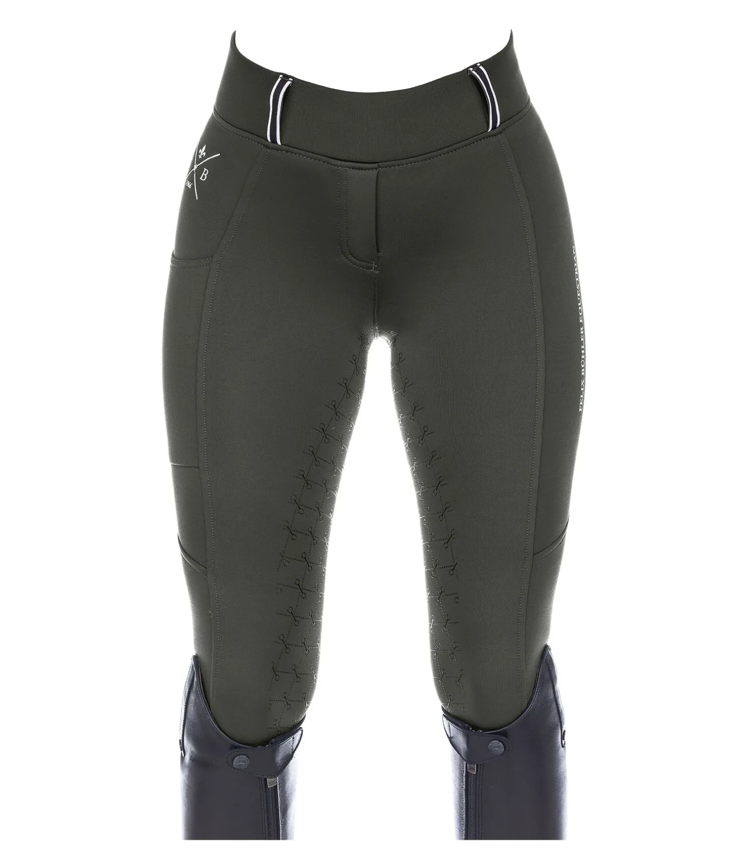 Legging d’équitation sportswear thermique avec fond intégral grip en silicone. Matière stretch respirante, extensible dans 4 directions. Séchage rapide. Intérieur molletonné. Imprimés Felix Bühler. Ceinture large avec passants. Une poche latérale zippée pour téléphone portable et deux fausses poches arrière. Aucune couture au niveau des genoux. Bas de jambe extensible. 60 % polyester, 33 % polyamide, 7% élasthanne.