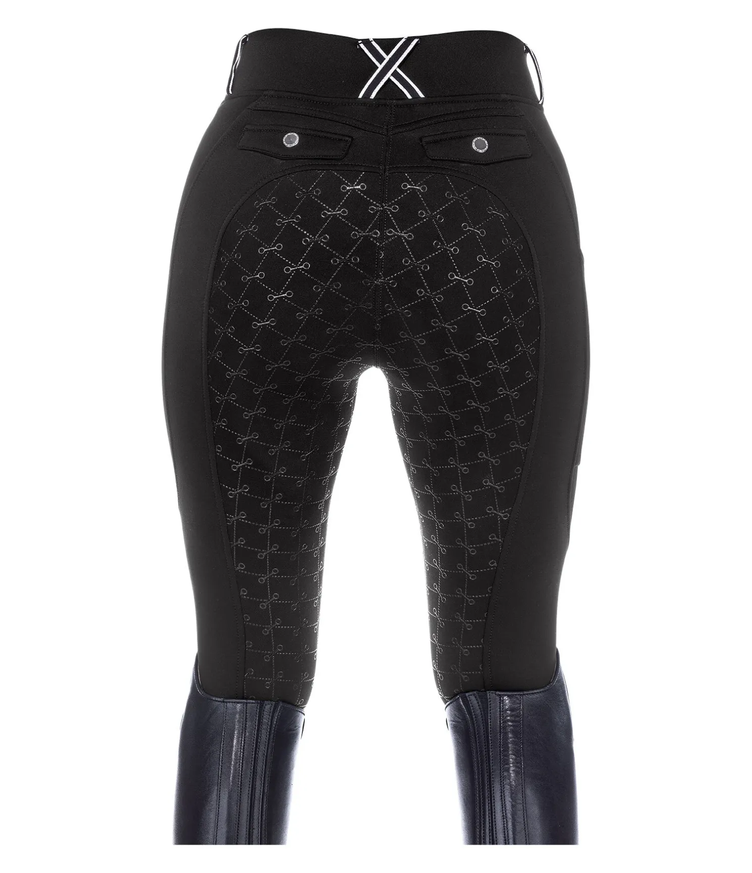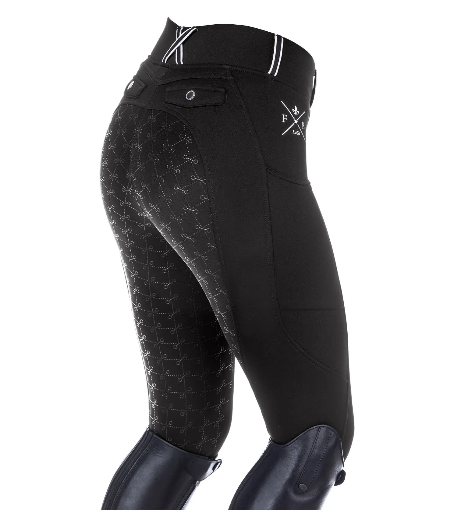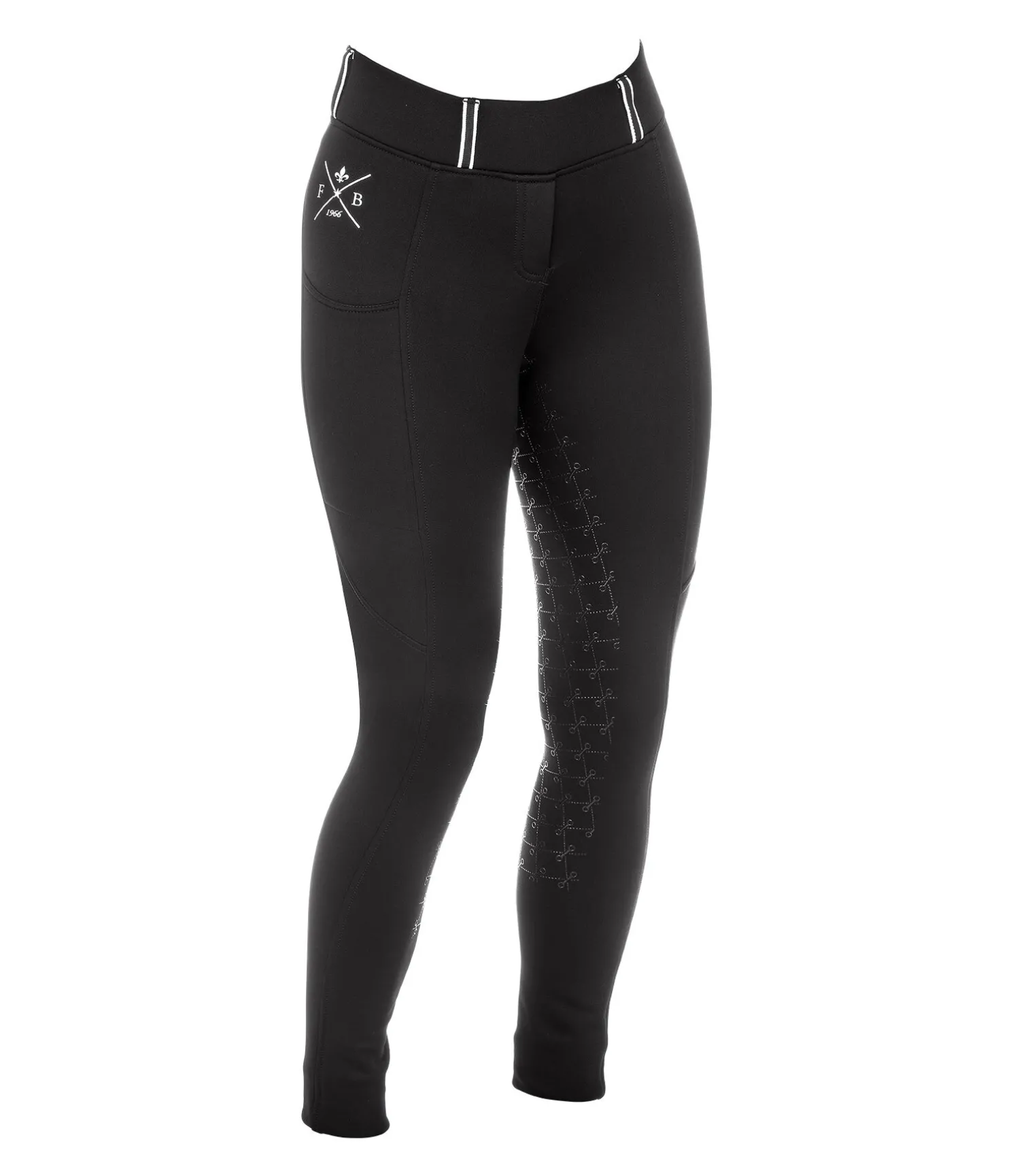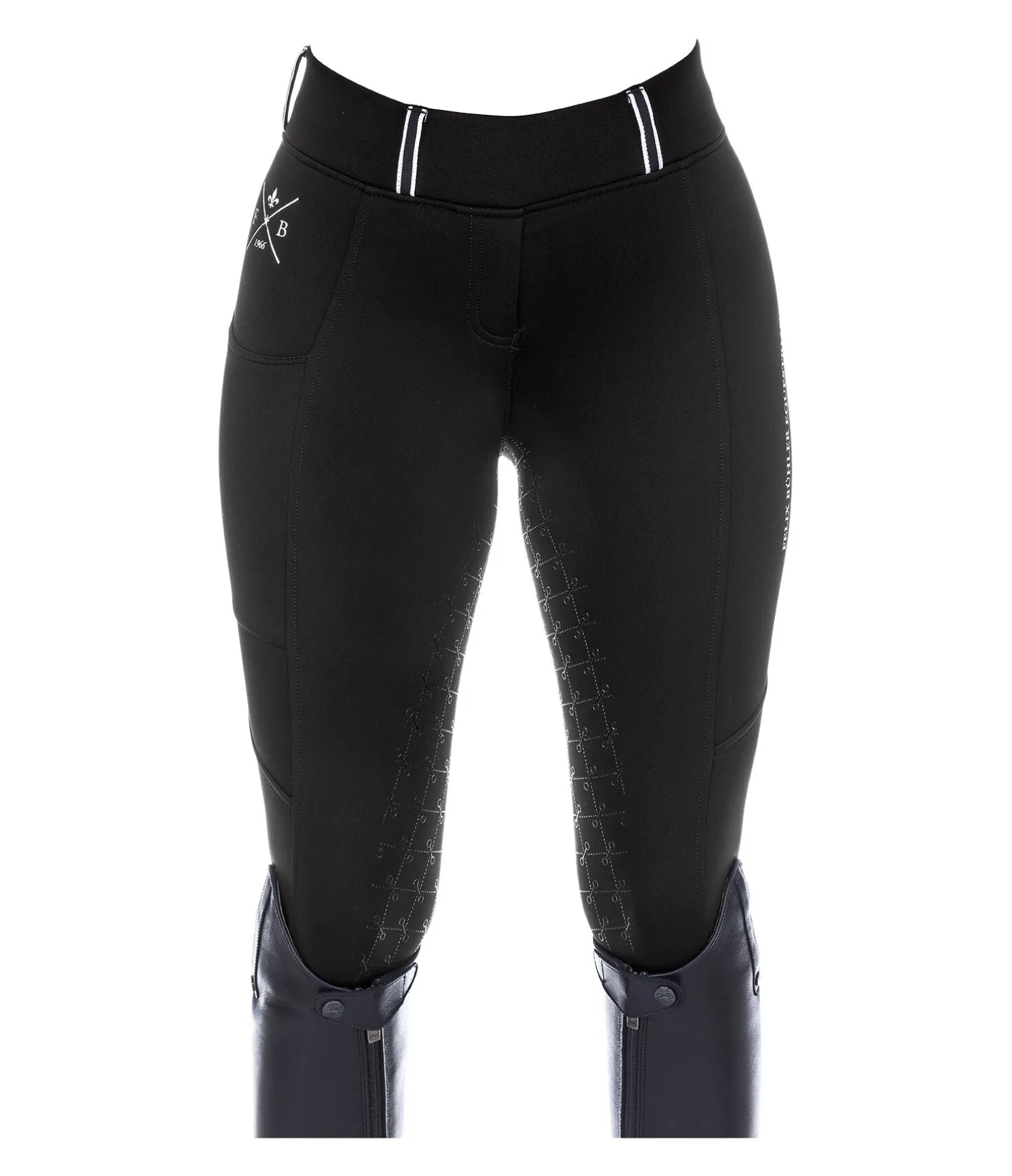Legging d’équitation sportswear thermique avec fond intégral grip en silicone. Matière stretch respirante, extensible dans 4 directions. Séchage rapide. Intérieur molletonné. Imprimés Felix Bühler. Ceinture large avec passants. Une poche latérale zippée pour téléphone portable et deux fausses poches arrière. Aucune couture au niveau des genoux. Bas de jambe extensible. 60 % polyester, 33 % polyamide, 7% élasthanne.
