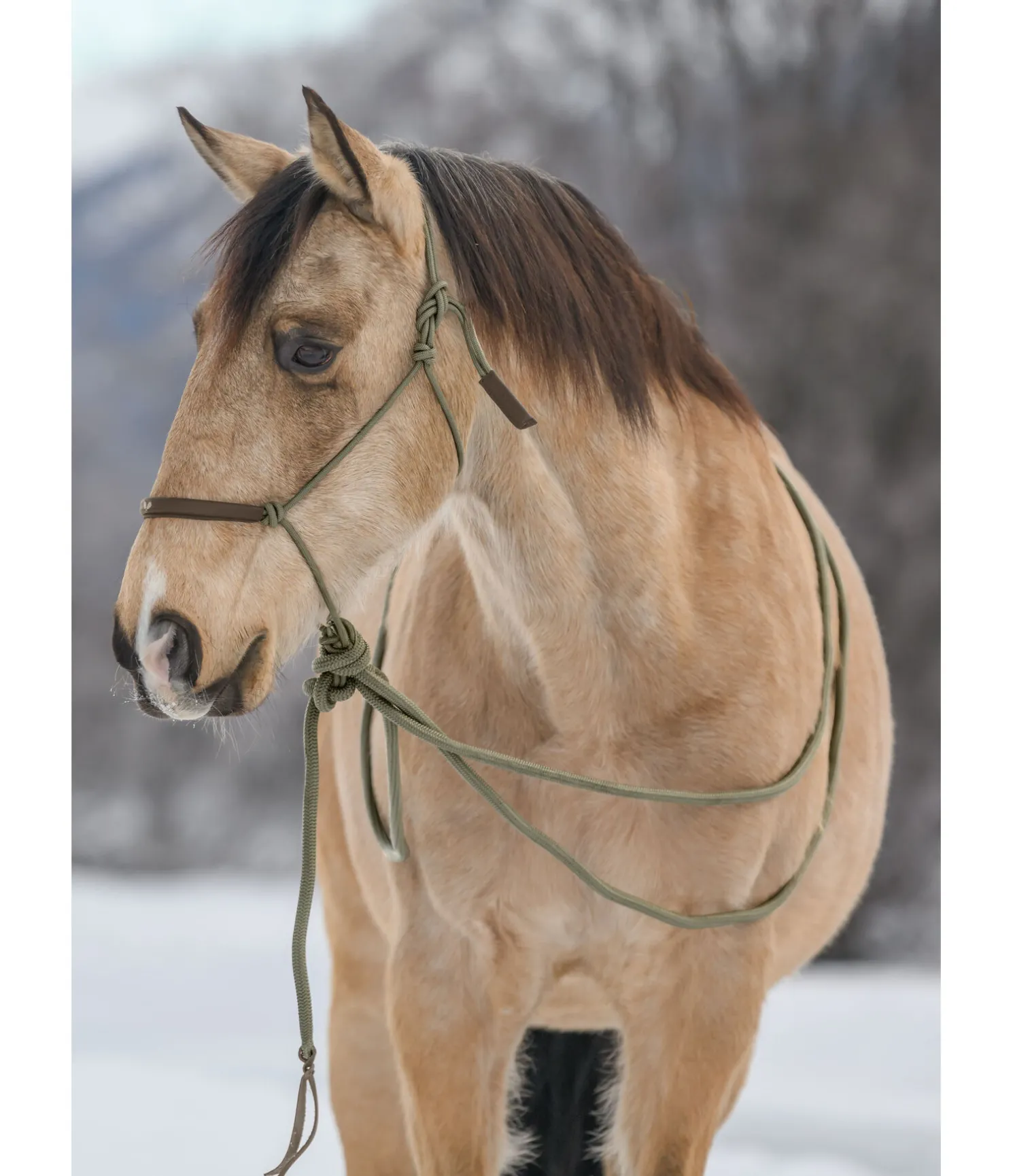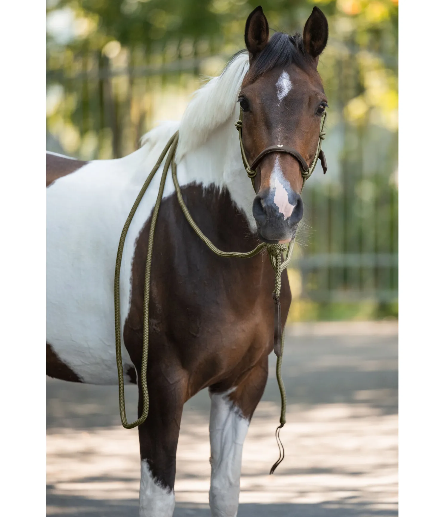 Locil à noeuds avec rênes mecate de 6,7 m de long ( Ø 1,6 cm) ce qui permet d’utiliser le licol également comme licol d’équitation ou de marche. Les extrémités des mecate sont dotées d’un revers en cuir. Rembourrage en cuir souple sur la muserolle avec logo en relief. Le noud du mécate peut être défait à la main, ce qui permet d’utiliser le licol comme licol à nouds normal. Le diamètre du licol est d’environ 0,7 cm: Licol 100 % de polypropylène.