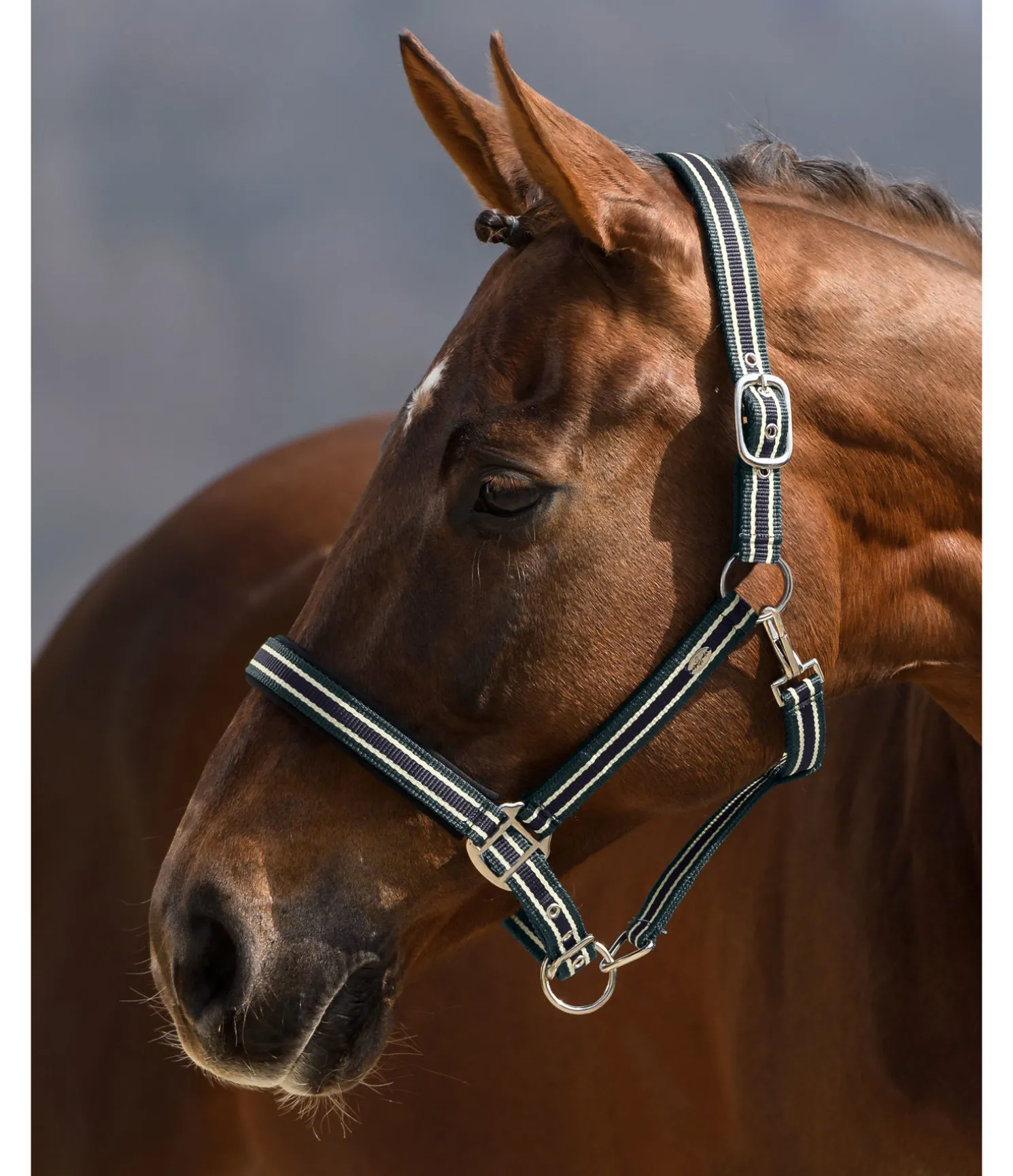 Licol rayé avec têtière, montants et muserolle doublés en caoutchouc chloroprène moelleux pour un confort optimal. Petite plaque métallique argentée avec logo gravé sur chaque montant. Têtière et muserolle réglables. Look sportif. 100 % polypropylène.