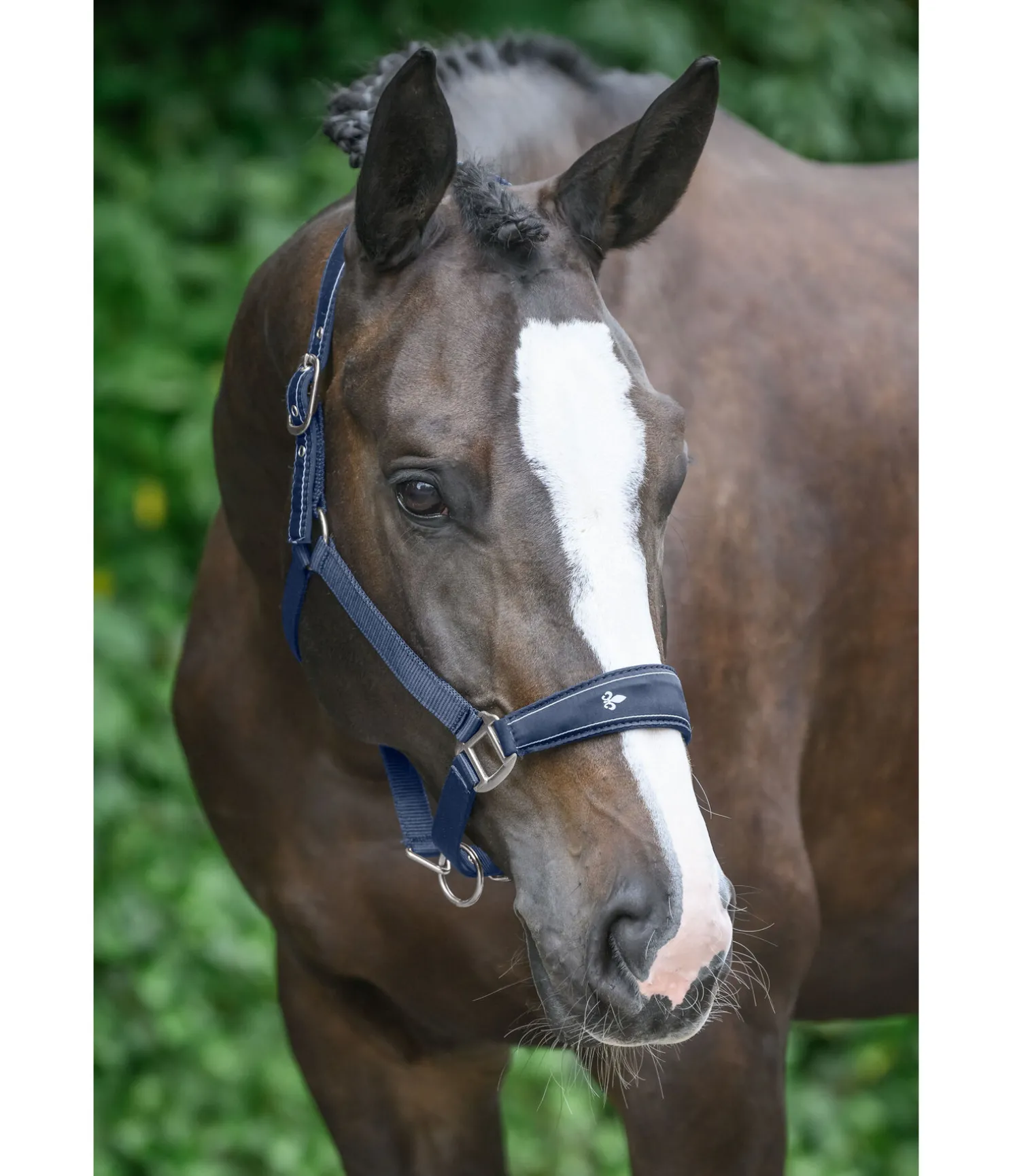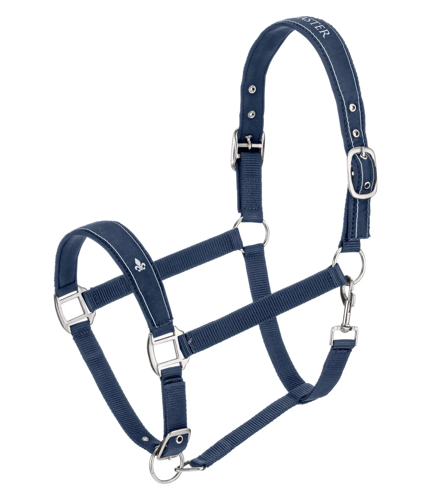 Licol sportif avec têtière et muserolle doublées de caoutchouc chloroprène doux. Lys blancs sur la muserolle. Têtière et muserolle réglables. Bouclerie argentée. Licol 100 % polypropylène.