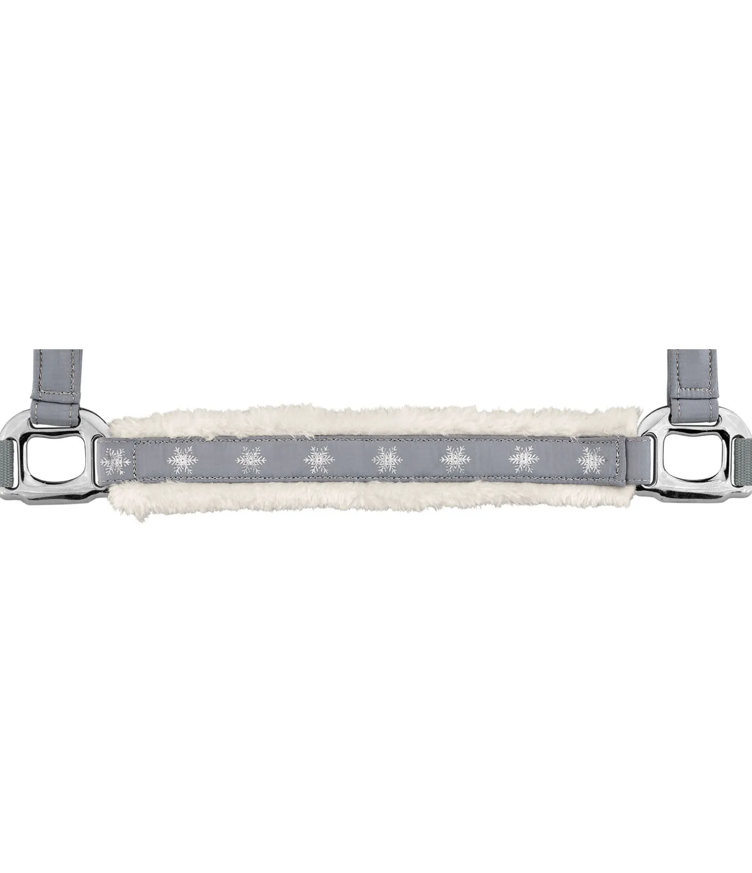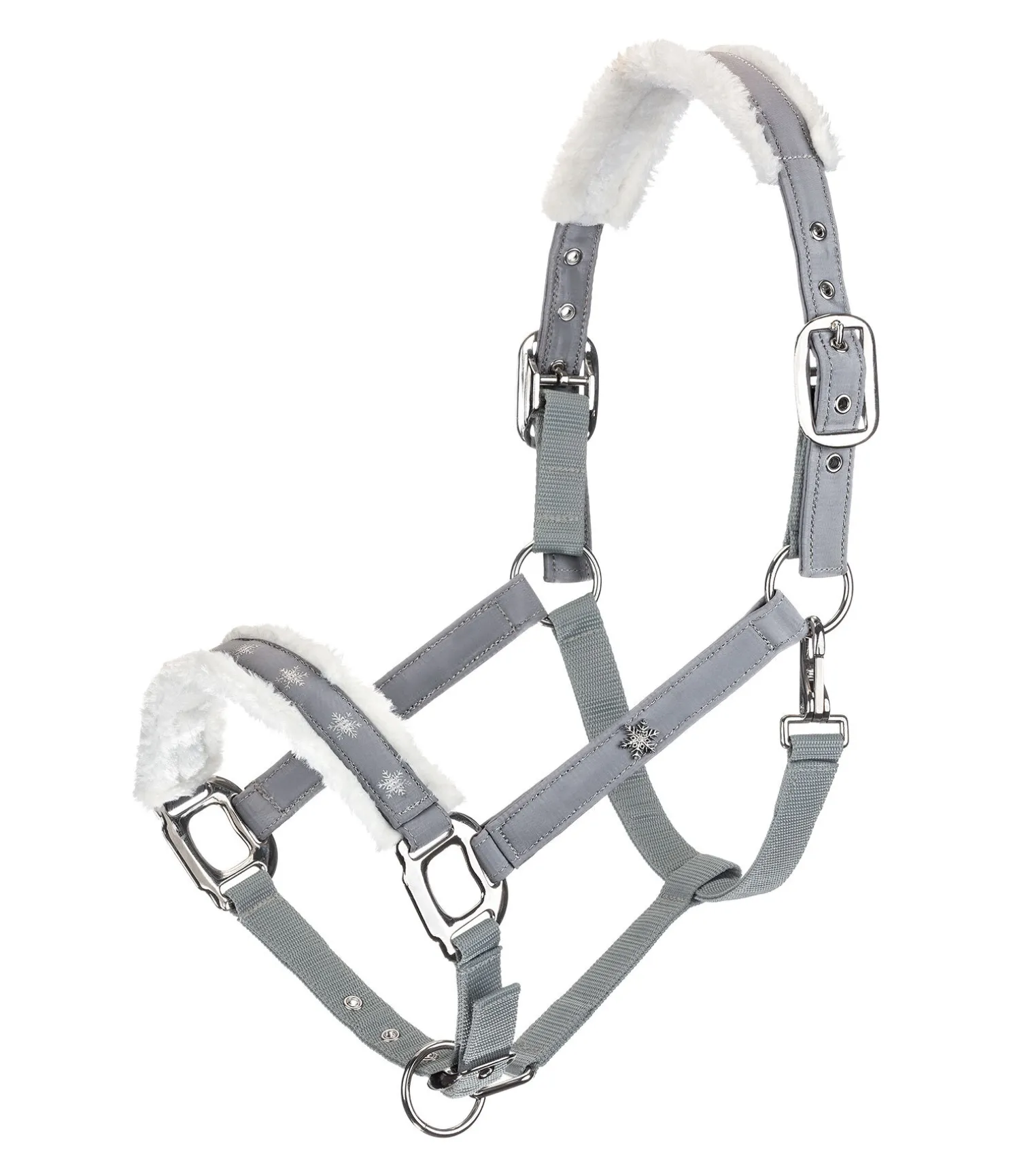 Licol de Noël. Rembourrage en polaire Teddy sur la têtière et la muserolle. Flocons de neige brodés sur la muserolle et sur chaque montant.