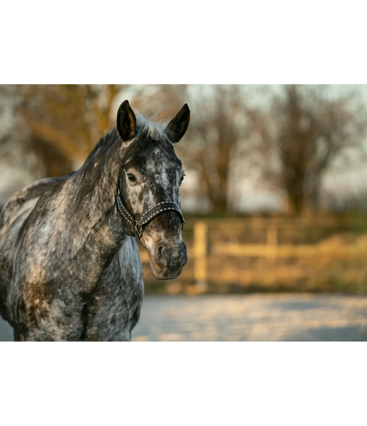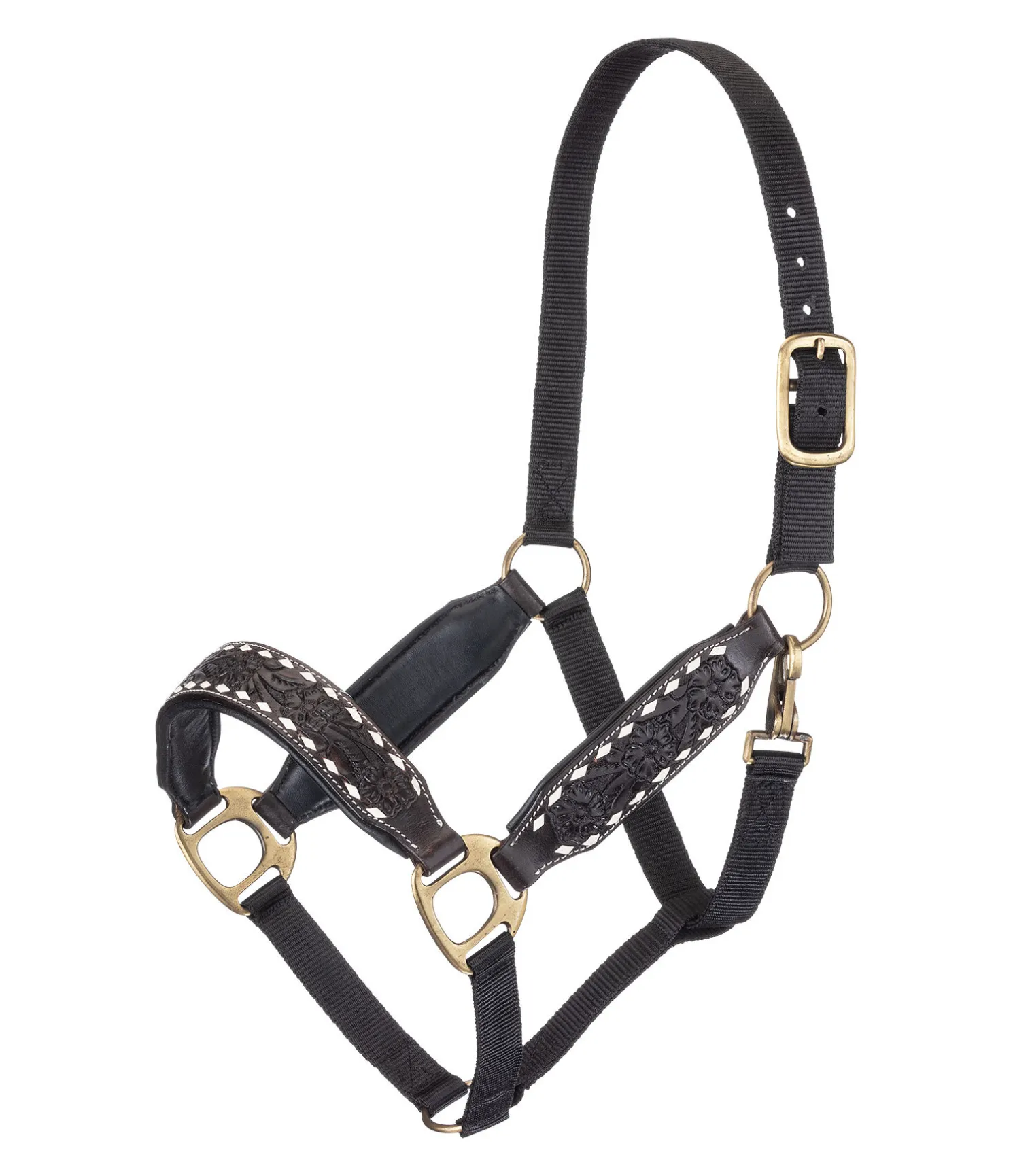 Licol chic en nylon et cuir véritable avec doublure douce. Avec gravure florale et détails en cuir brut. Têtière réglable. Bouclerie de haute qualité en couleur laiton.