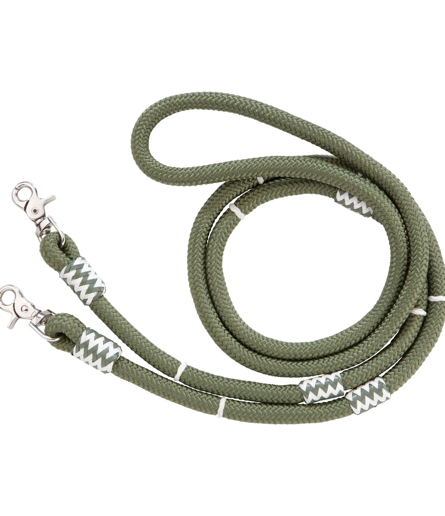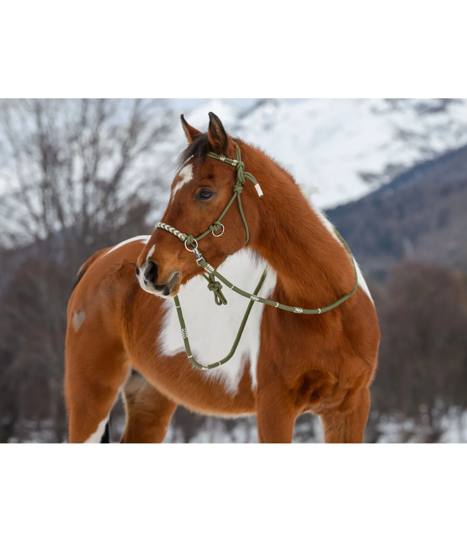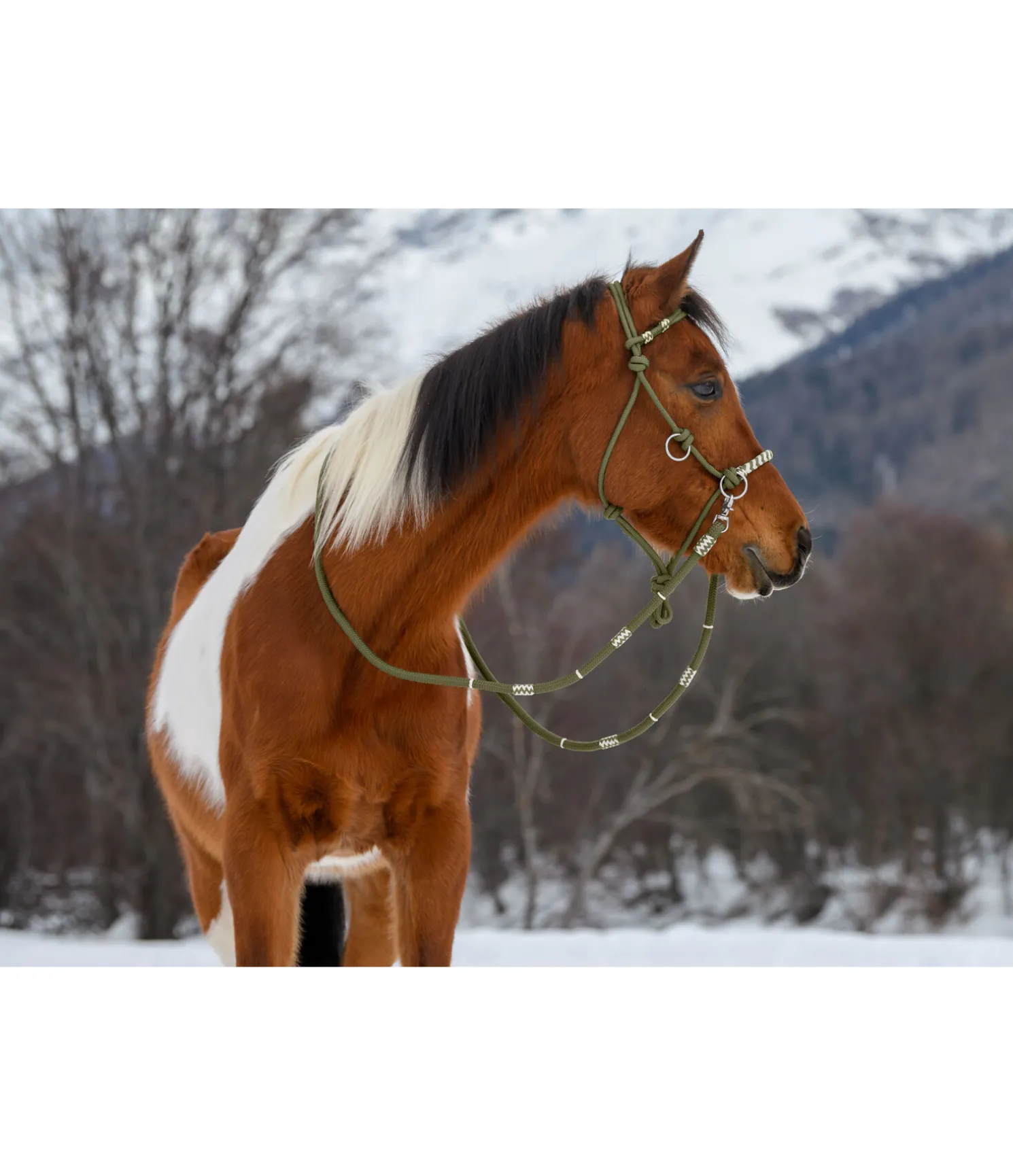 « Bridon – licol à noeuds » innovant disposant de 3 fonctionnalités différentes et d’un joli look cuir brut. Utilisable en licol pour le travail au sol ou en bridon avec ou sans mors. Possibilité de fixer en un tour de main un mors ou un hackamore grâce aux montants en cuir sur les côtés. Rênes assorties incluses avec jolie décoration cuir brut !
