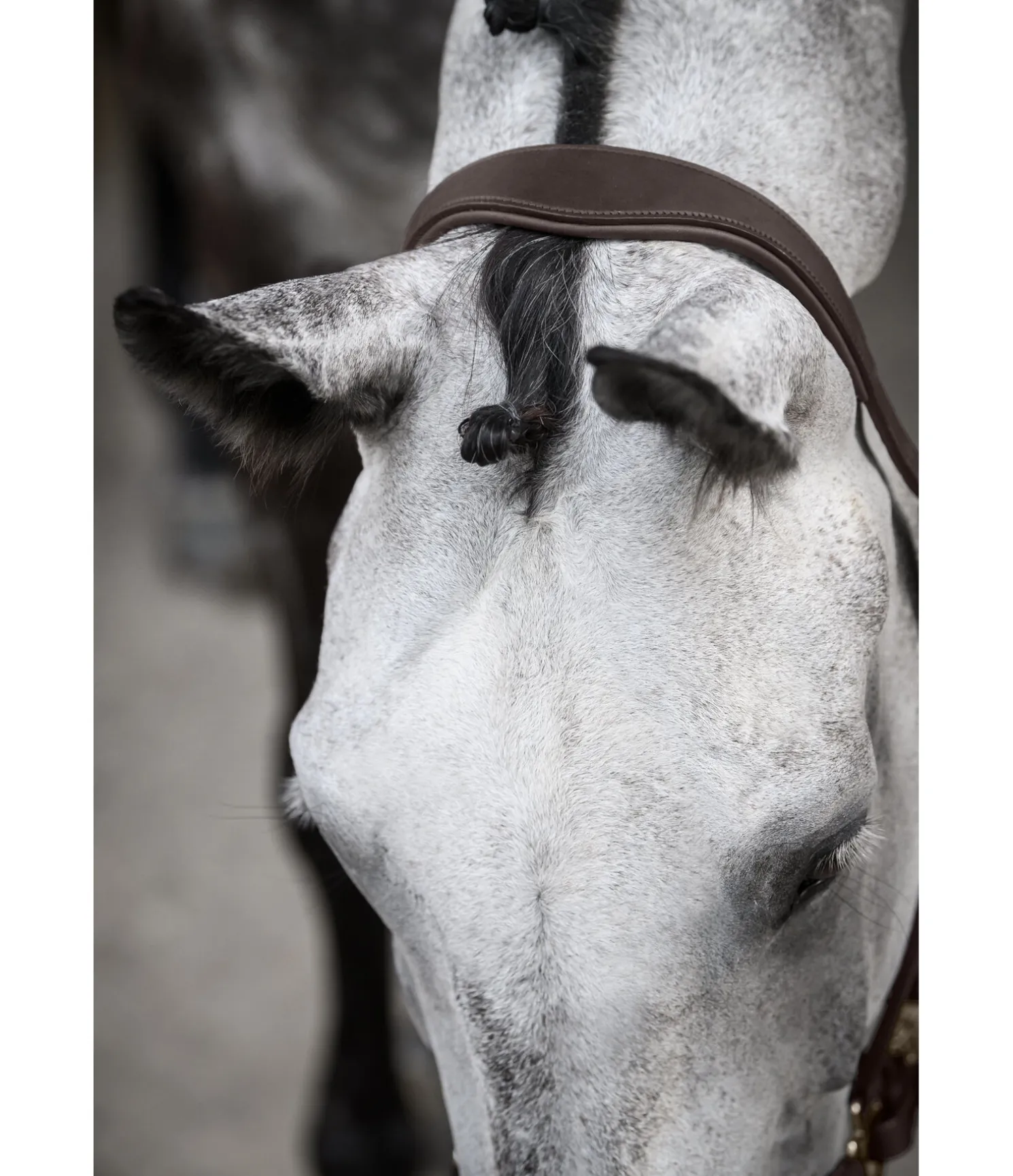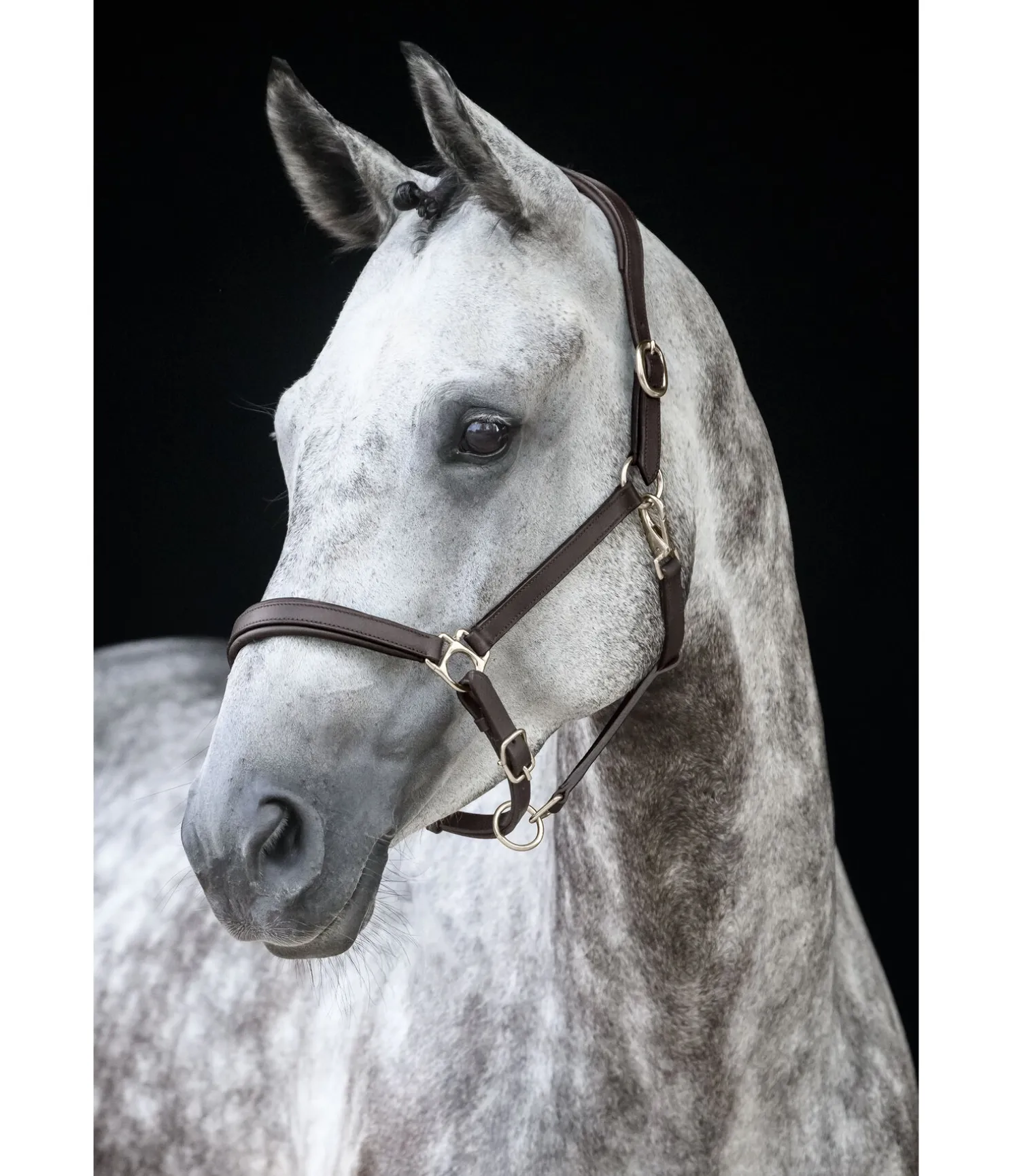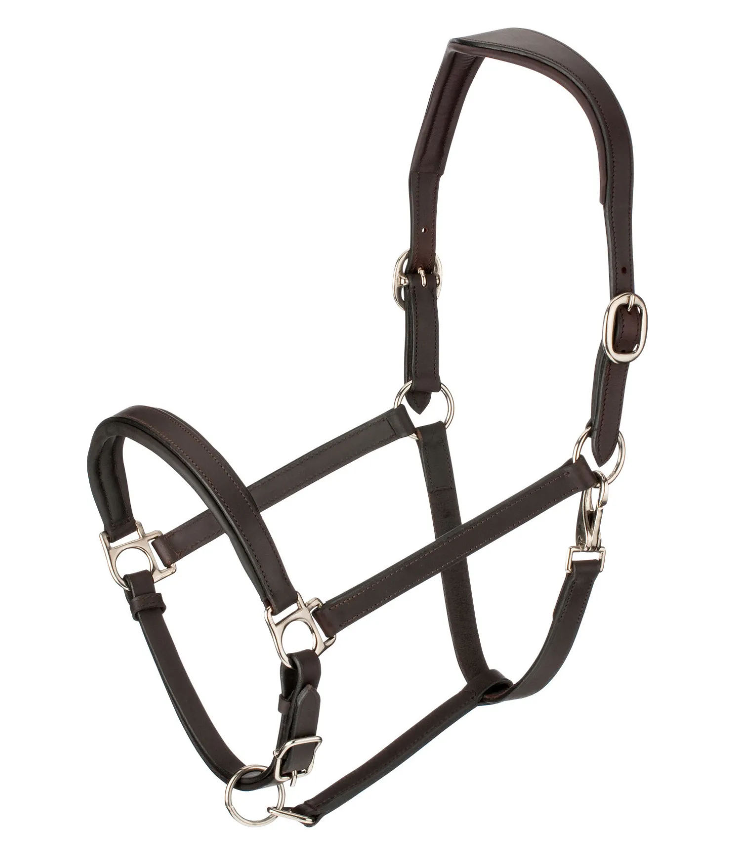 Licol de forme anatomique en cuir gras avec doublure douce en cuir à la têtière et la muserolle. Gaufrage logo discret sur la têtière. Têtière et muserolle réglables. Bouclerie argentée.