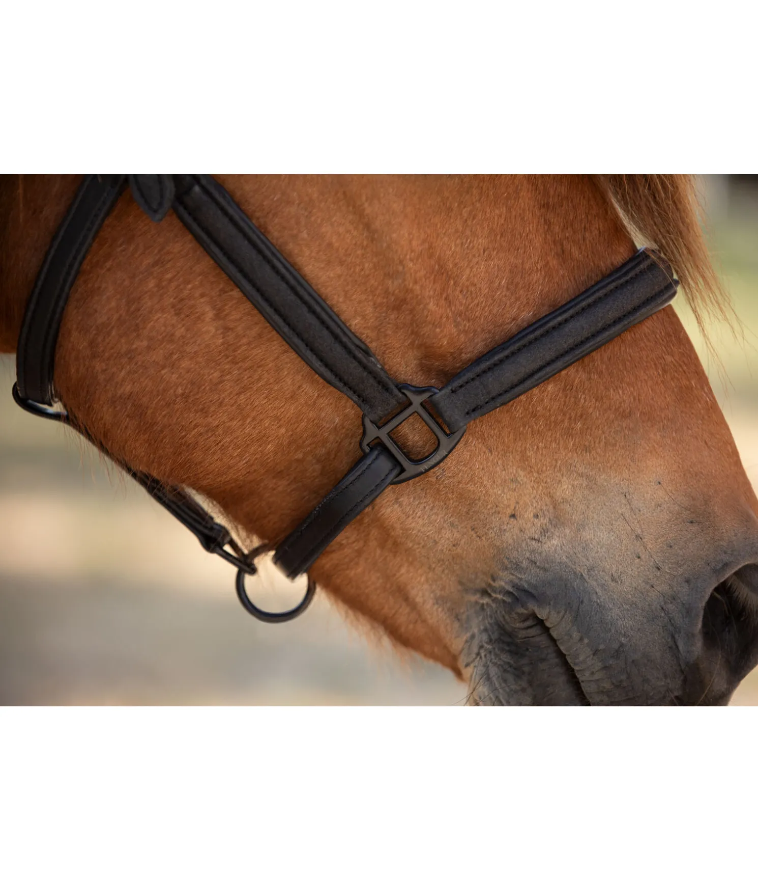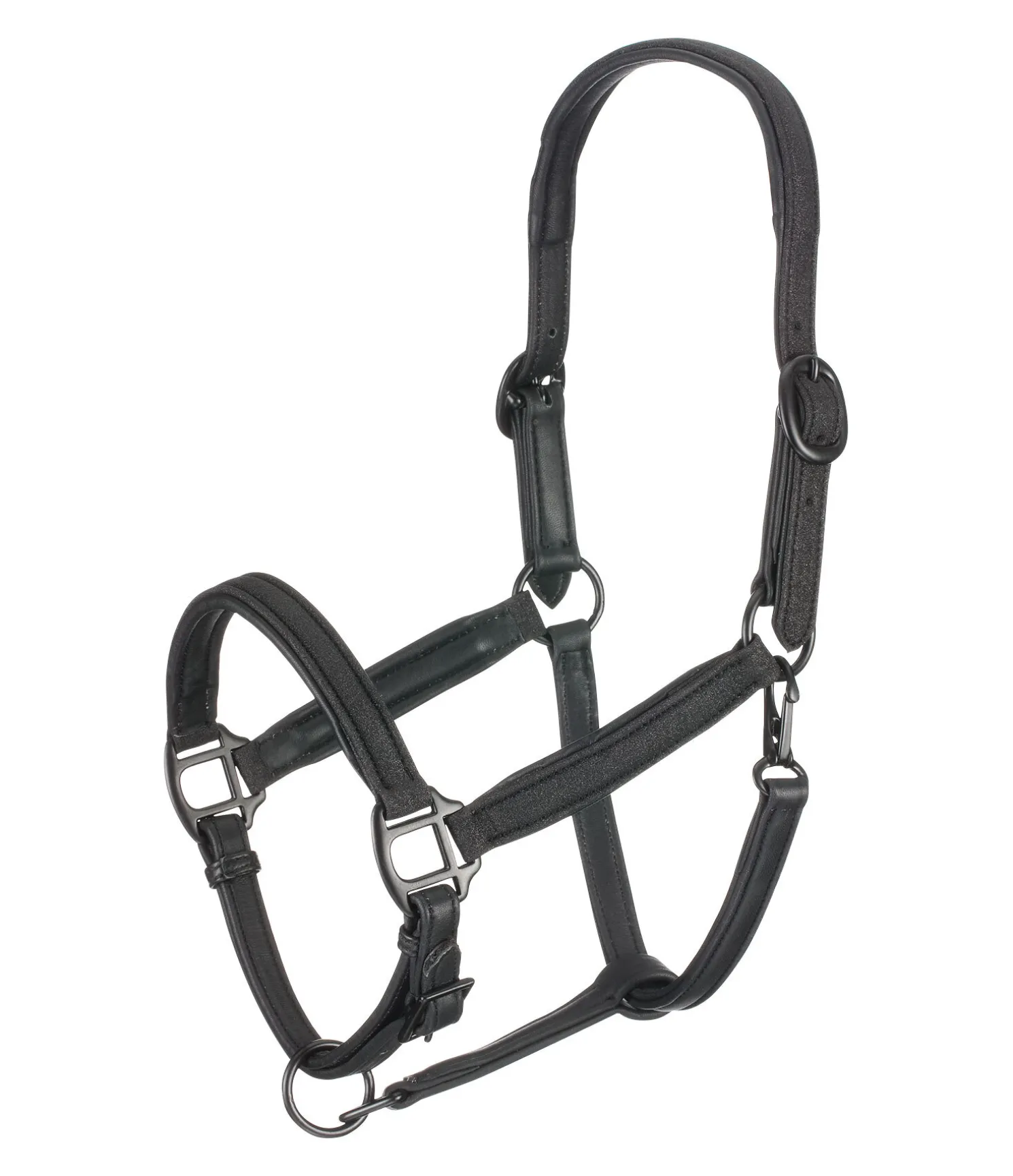Élégant licol en cuir avec boucles noires. Effet pailleté sur la muserolle, les montants et la têtière. Têtière doublement réglable. Muserolle réglable. Doublure moelleuse.