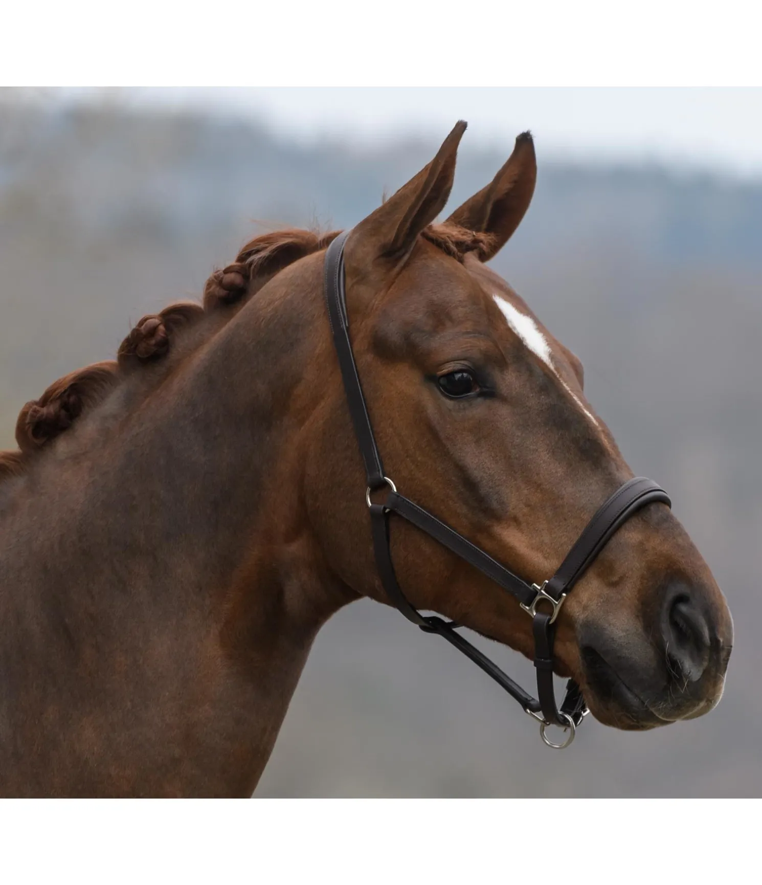 Licol en cuir gras classique de coupe simple avec doublure en cuir moelleux à la têtière et à la muserolle. Logo discret embossé sur la têtière. Têtière et muserolle facilement réglables. Bouclerie argentée.