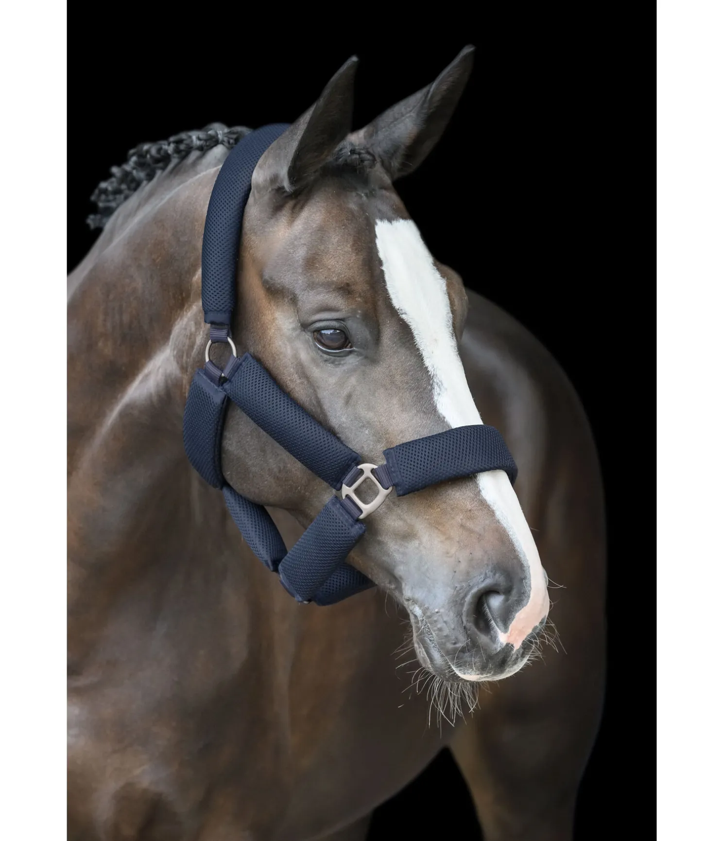 Licol confortable entièrement doublé de mesh. Le rembourrage en tissu Air mesh respirant réduit les points de pression et permet une circulation de l’air permanente. Bouclerie matte argentée. Têtière réglable. Licol 100 % polypropylène.