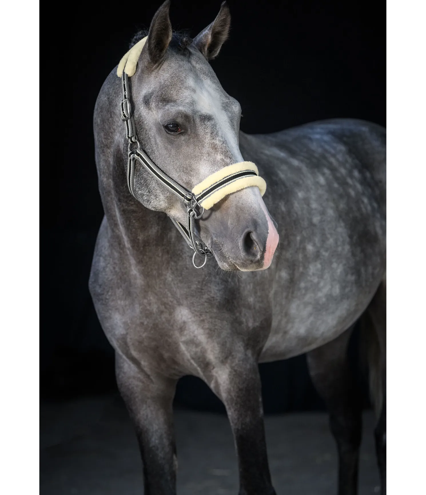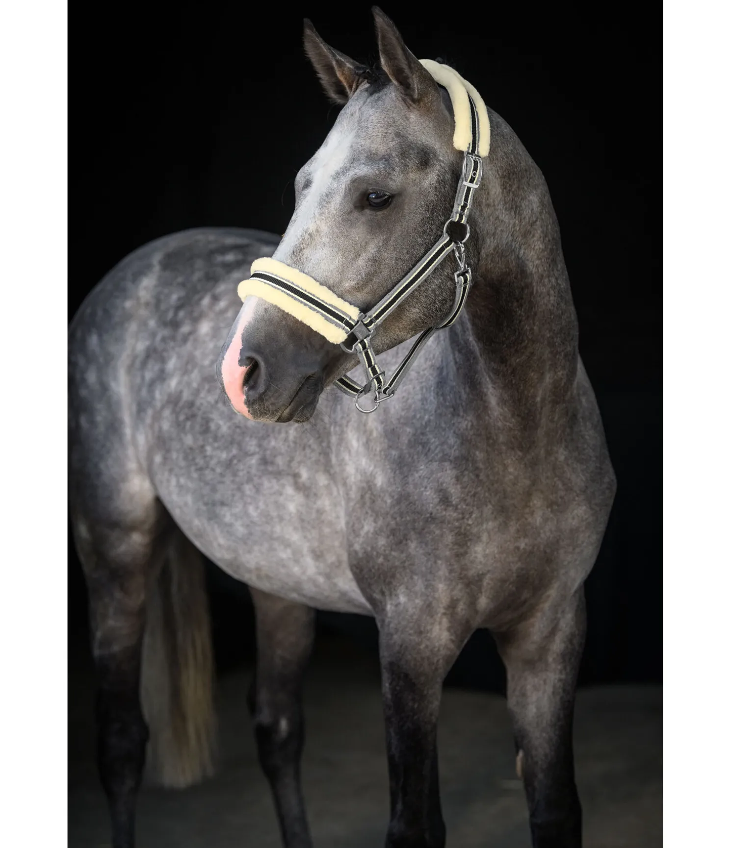Licol sportswear avec doublure en polaire Teddy douce sur la têtière et muserolle et en caoutchouc-chloroprène moelleux sur les montants. Design tricolore tendance. Têtière doublement réglable et muserolle réglable. Bouclerie en métal de couleur assortie. Licol 100 % polypropylène, polaire Teddy 100 % polyester.