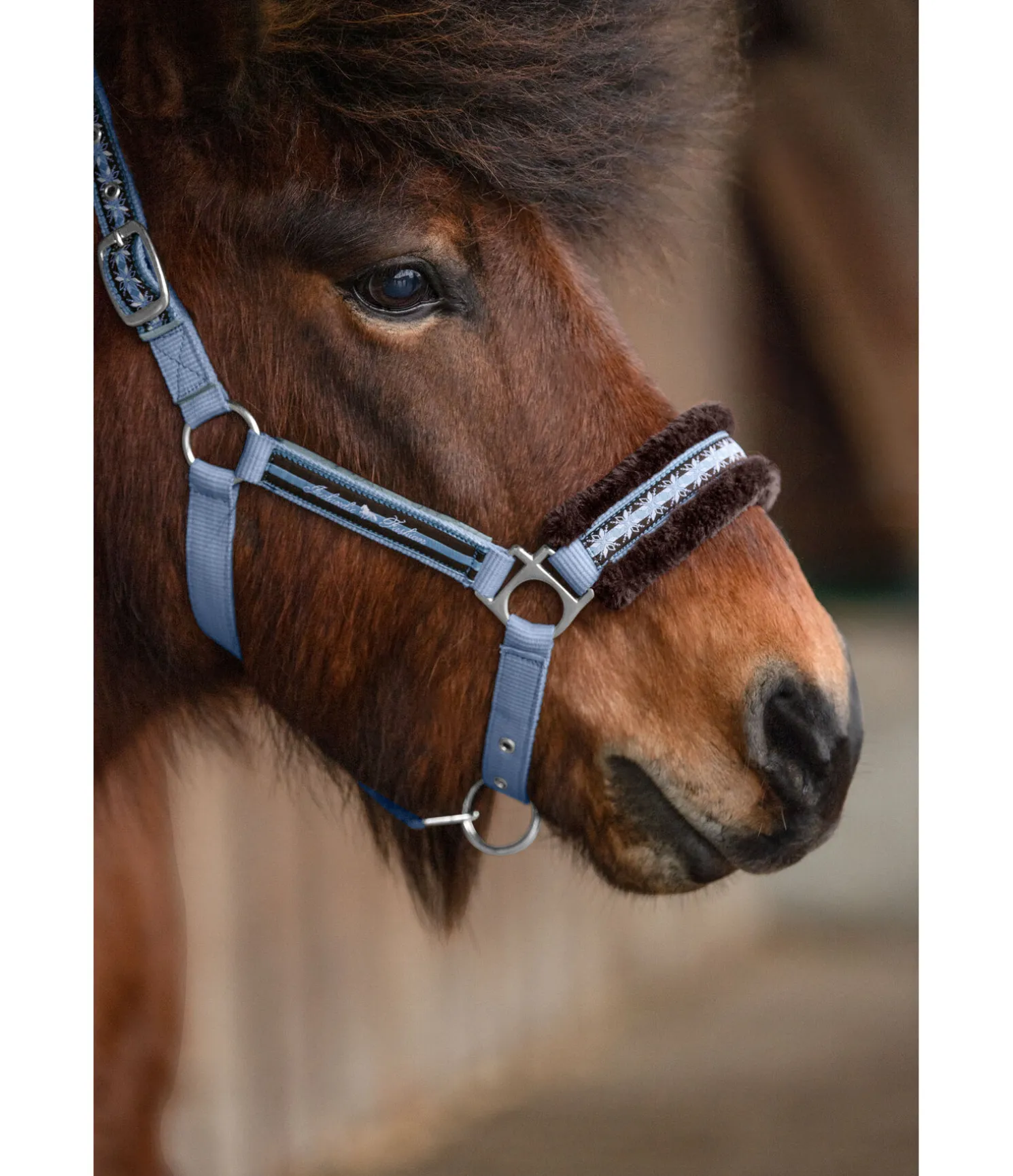 Licol en polaire Teddy au look nordique. Taille réglable de chaque côté au niveau de la têtière et facilement ajustable au niveau de la muserolle. 100 % polyester.