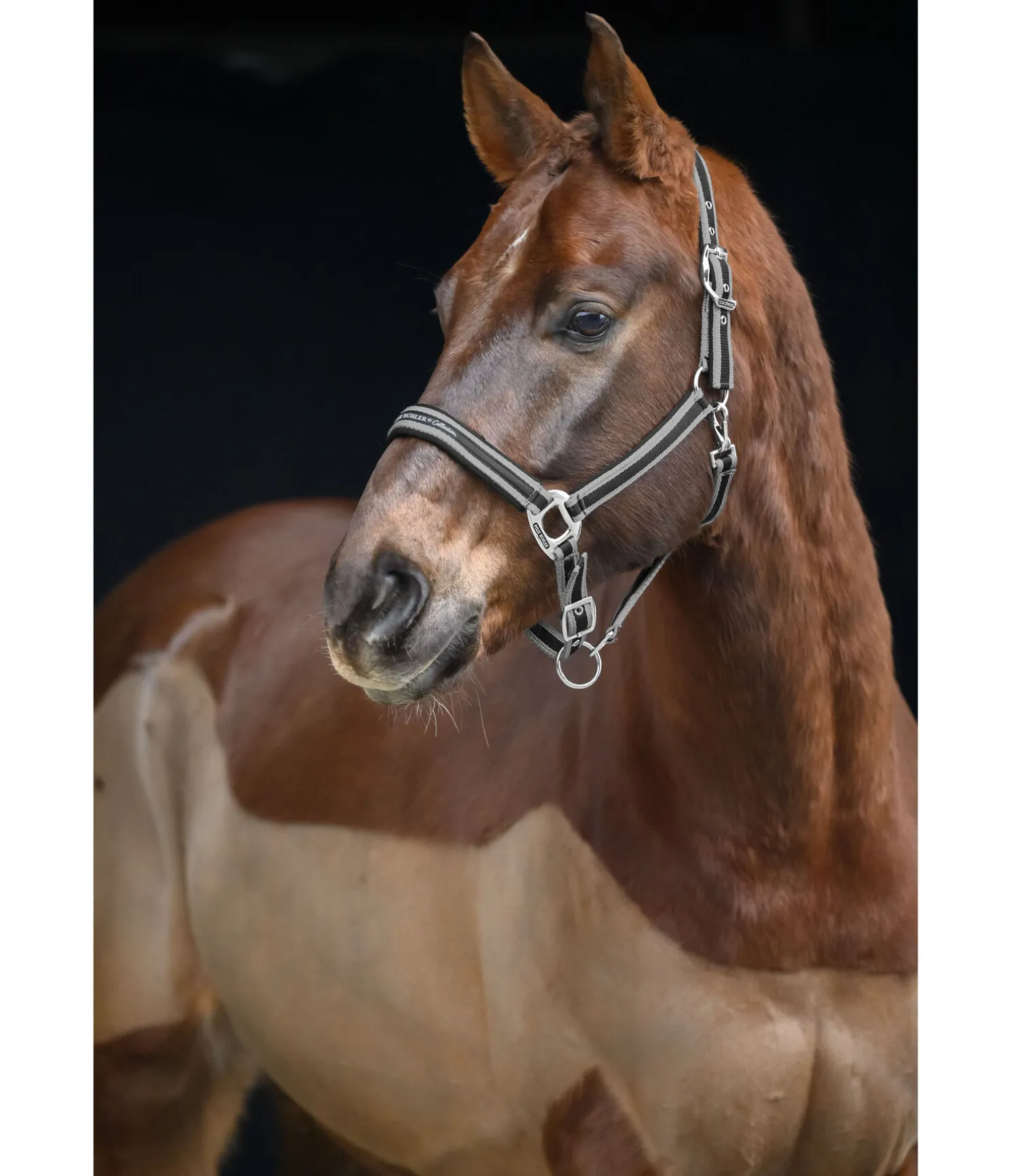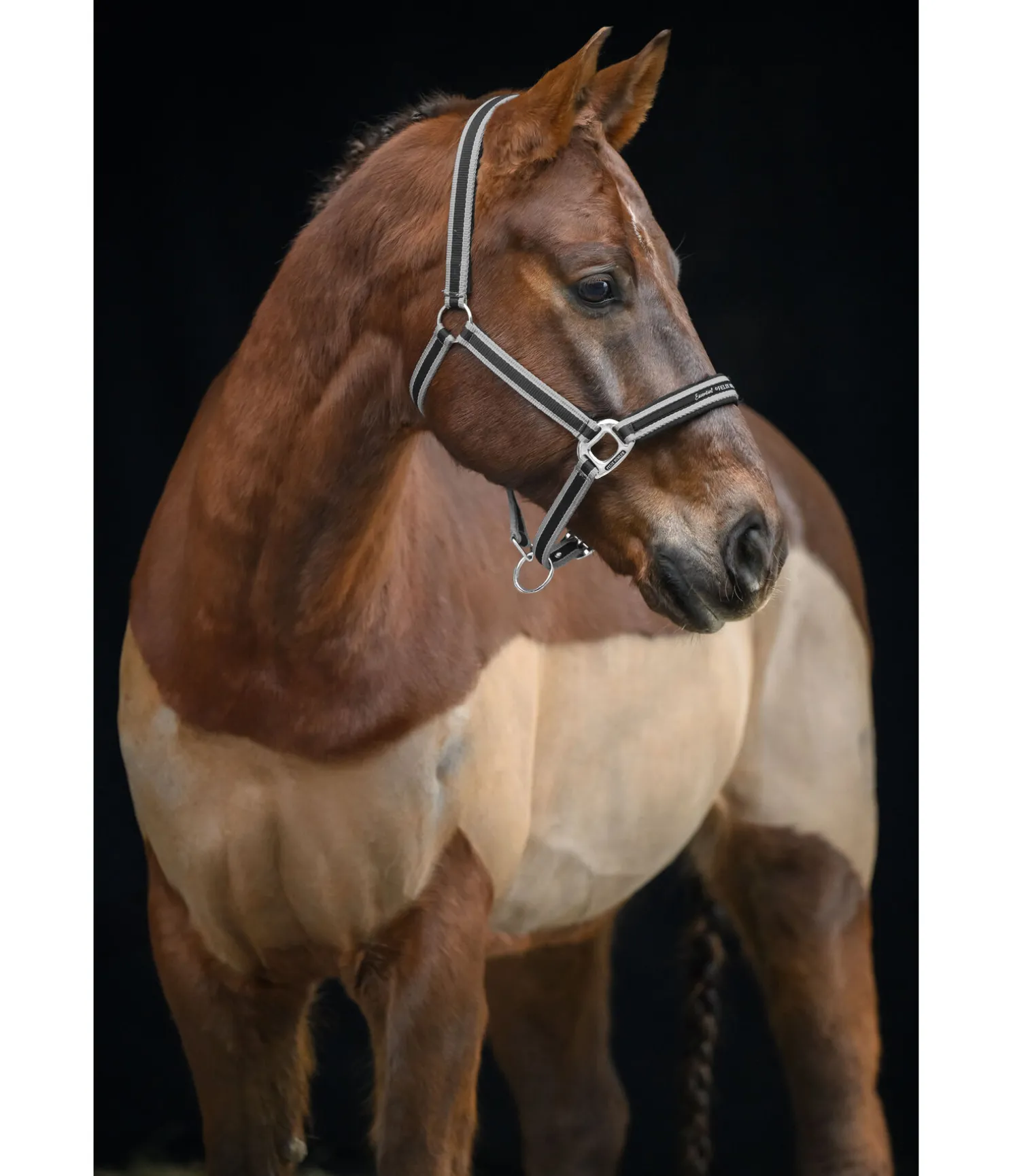 Licol rayé dans un look sportif avec élégante bande cousue sur la muserolle. Doublure douce en caoutchouc chloroprène sur la têtière, la muserolle et les montants. Têtière et muserolle réglables. Licol 100 % polypropylène.