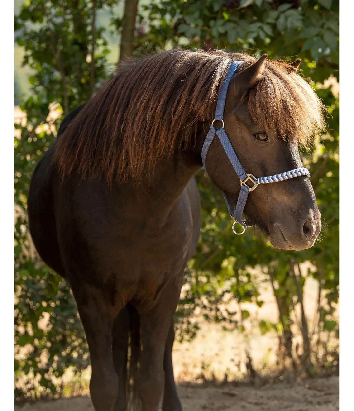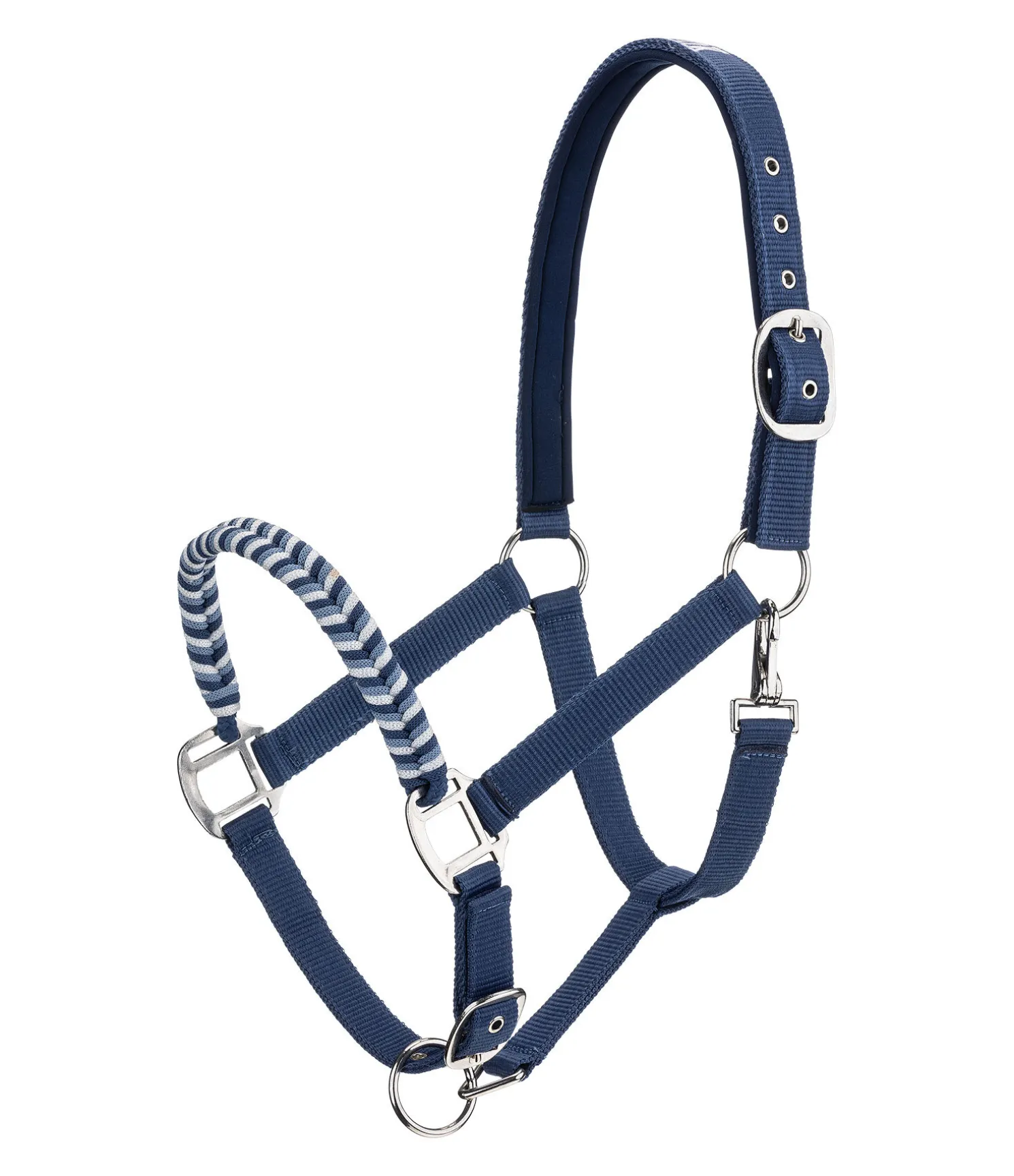 Licol exceptionnel avec muserolle tressée dans un look tricolore et broderie logo sur la têtière. Muserolle et têtière réglables. Têtière avec doublure moelleuse en caoutchouc chloroprène.