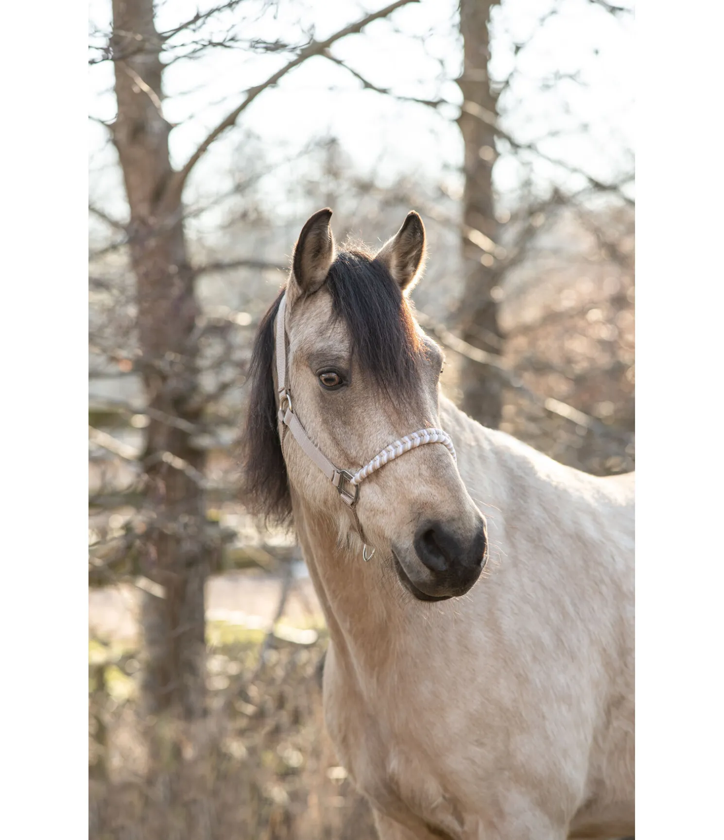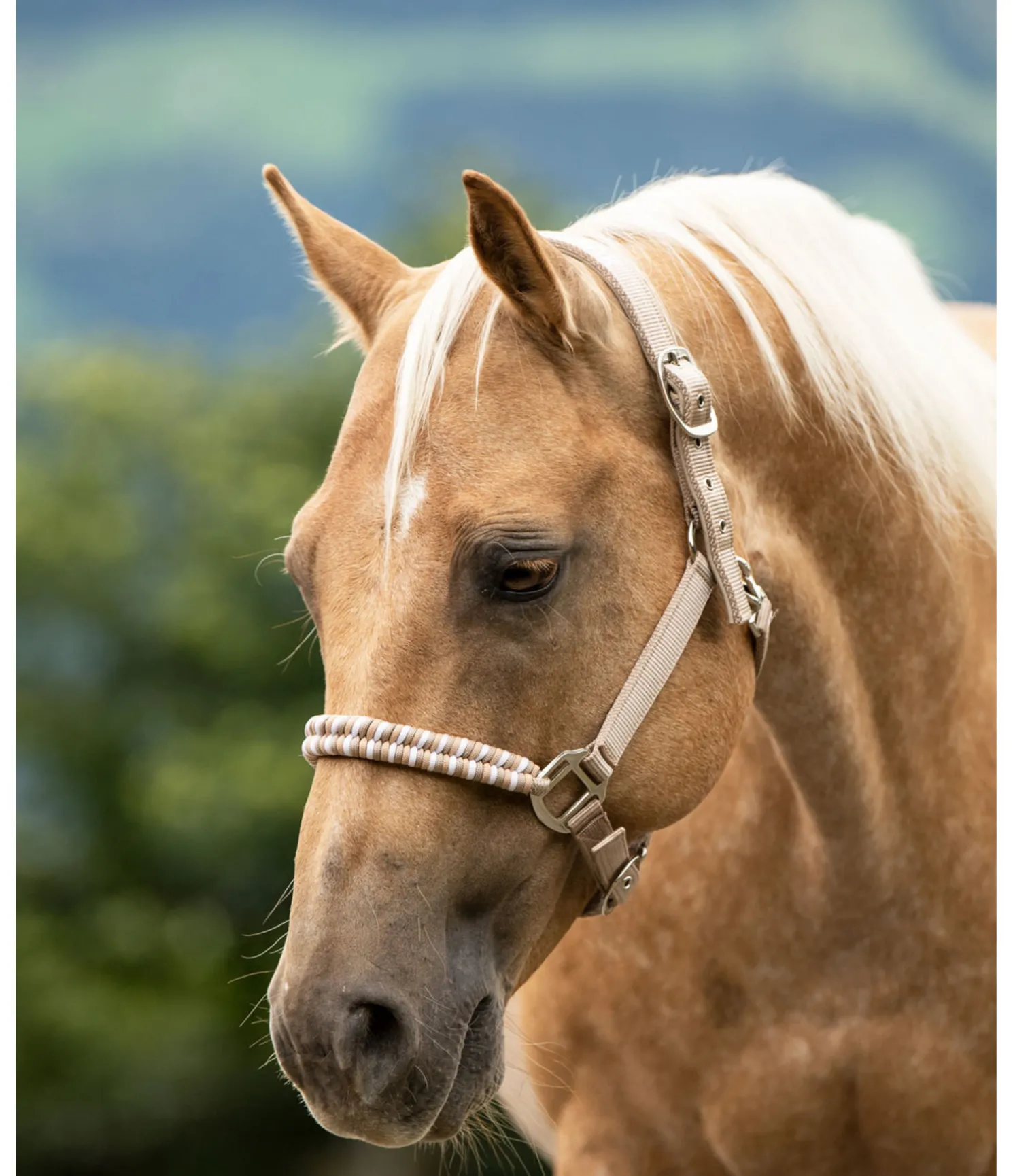 Licol exceptionnel avec muserolle tressée dans un look tricolore et broderie logo sur la têtière. Muserolle et têtière réglables. Têtière avec doublure moelleuse en caoutchouc chloroprène.