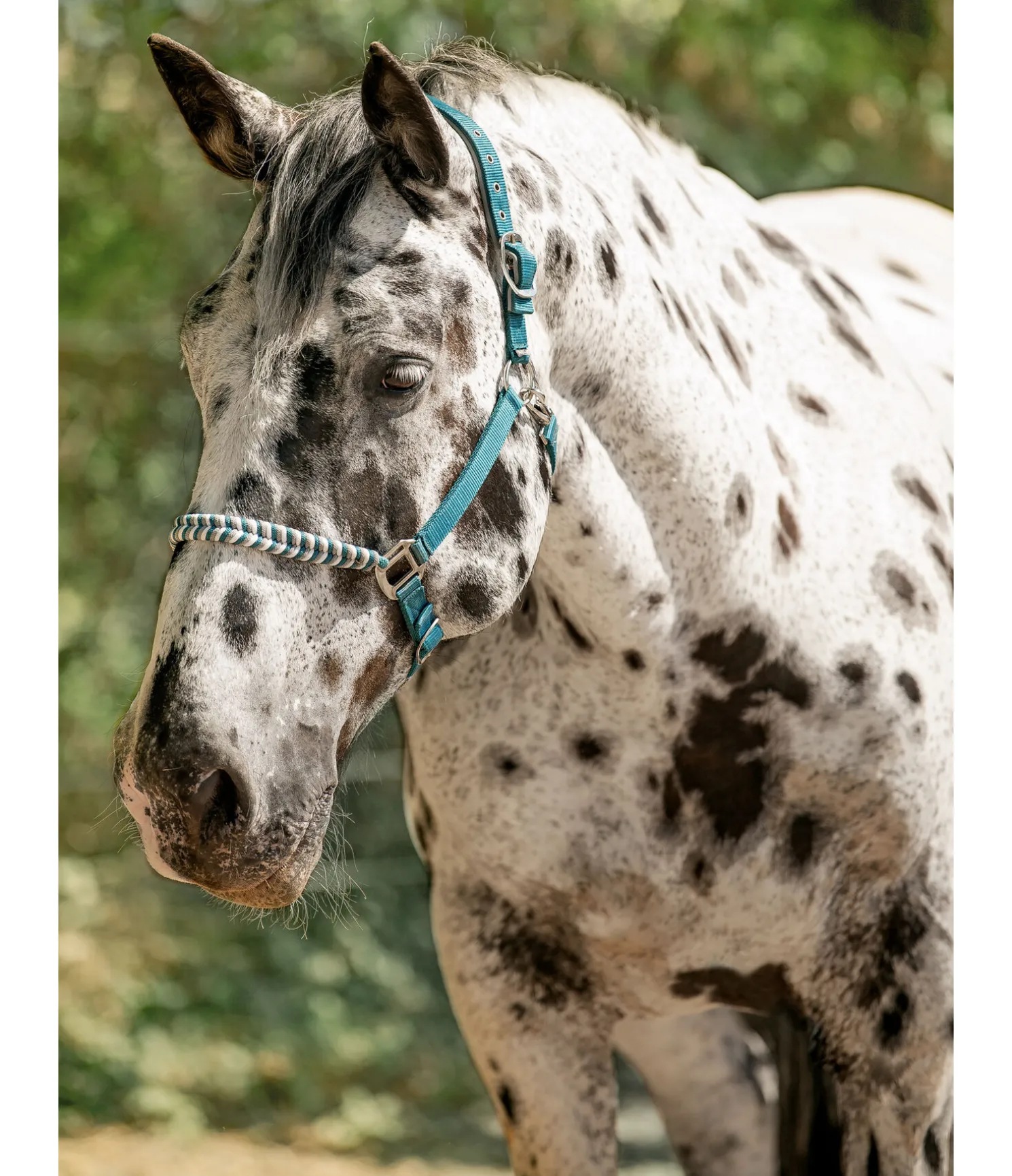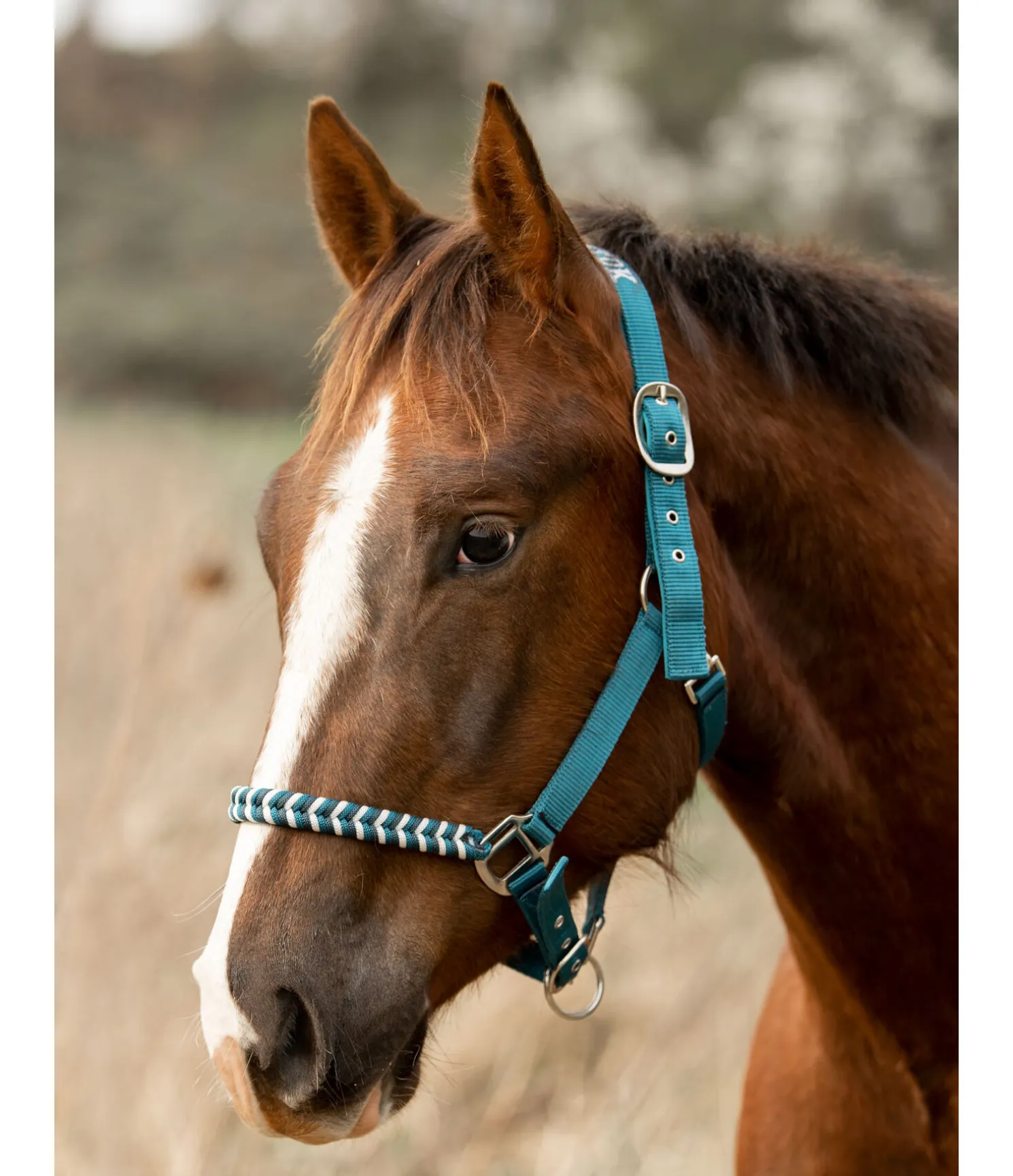 Licol exceptionnel avec muserolle tressée dans un look tricolore et broderie logo sur la têtière. Muserolle et têtière réglables. Têtière avec doublure moelleuse en caoutchouc chloroprène.