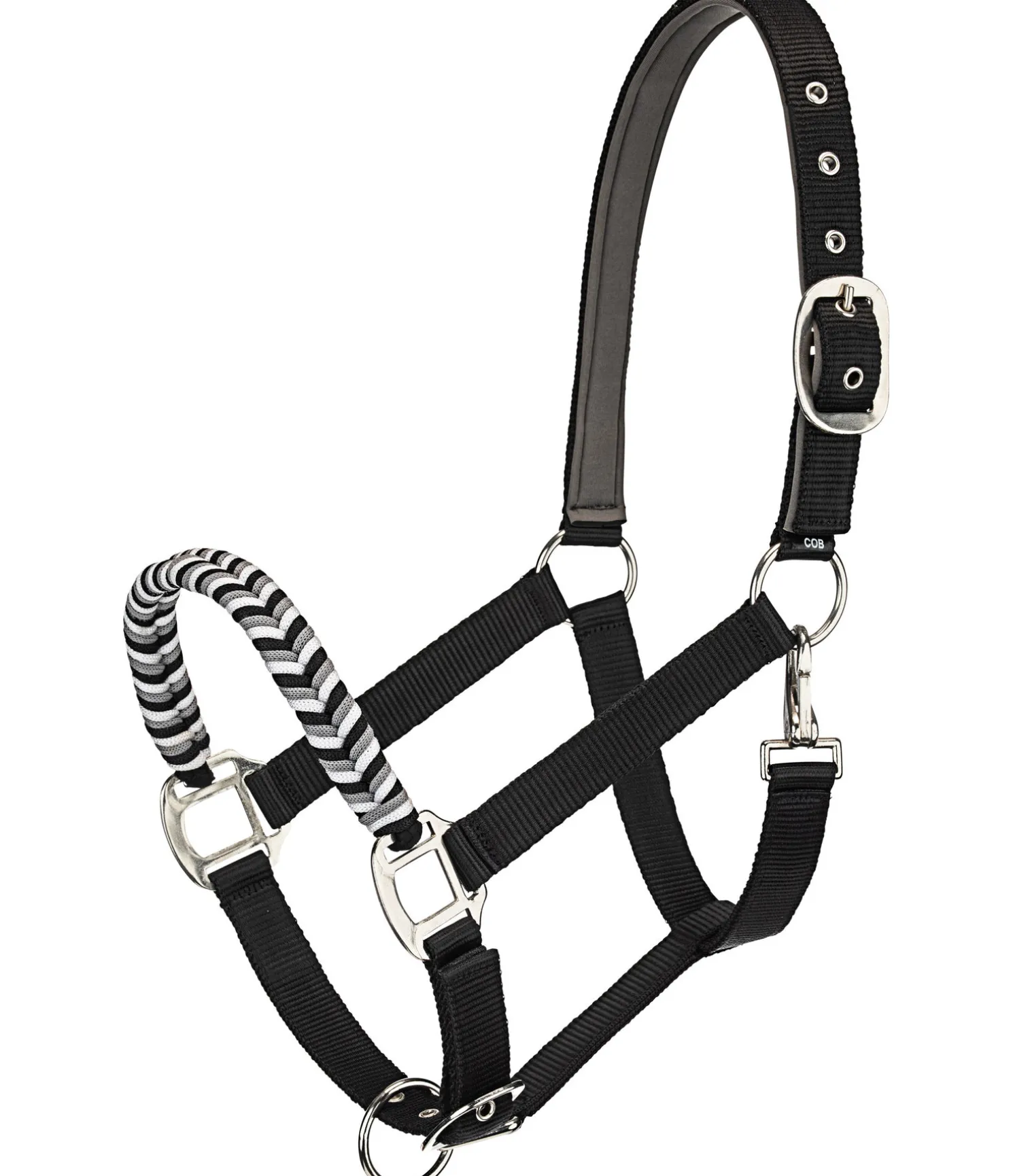 Licol exceptionnel avec muserolle tressée dans un look tricolore et broderie logo sur la têtière. Muserolle et têtière réglables. Têtière avec doublure moelleuse en caoutchouc chloroprène.