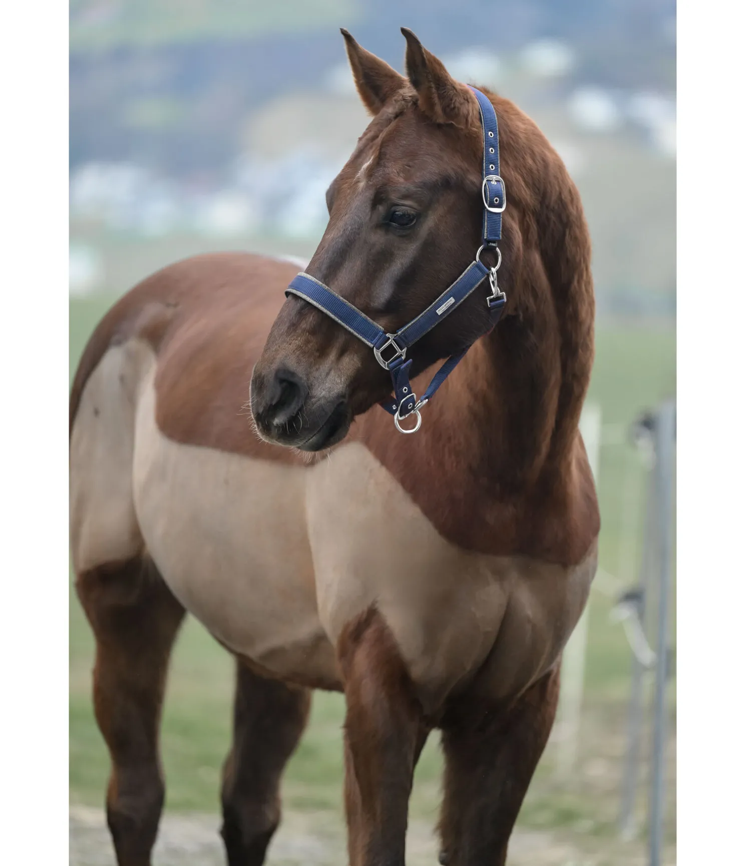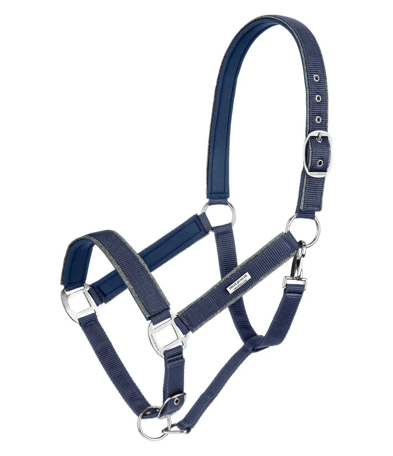 Licol chic avec passepoil scintillant et bouclerie de couleur assortie. Têtière, muserolle et montants avec doublure douce en caoutchouc chloroprène pour un confort maximal. Plaque métallique discrète avec logo gravé sur le montant gauche. Têtière et muserolle réglables. 100 % polypropylène.