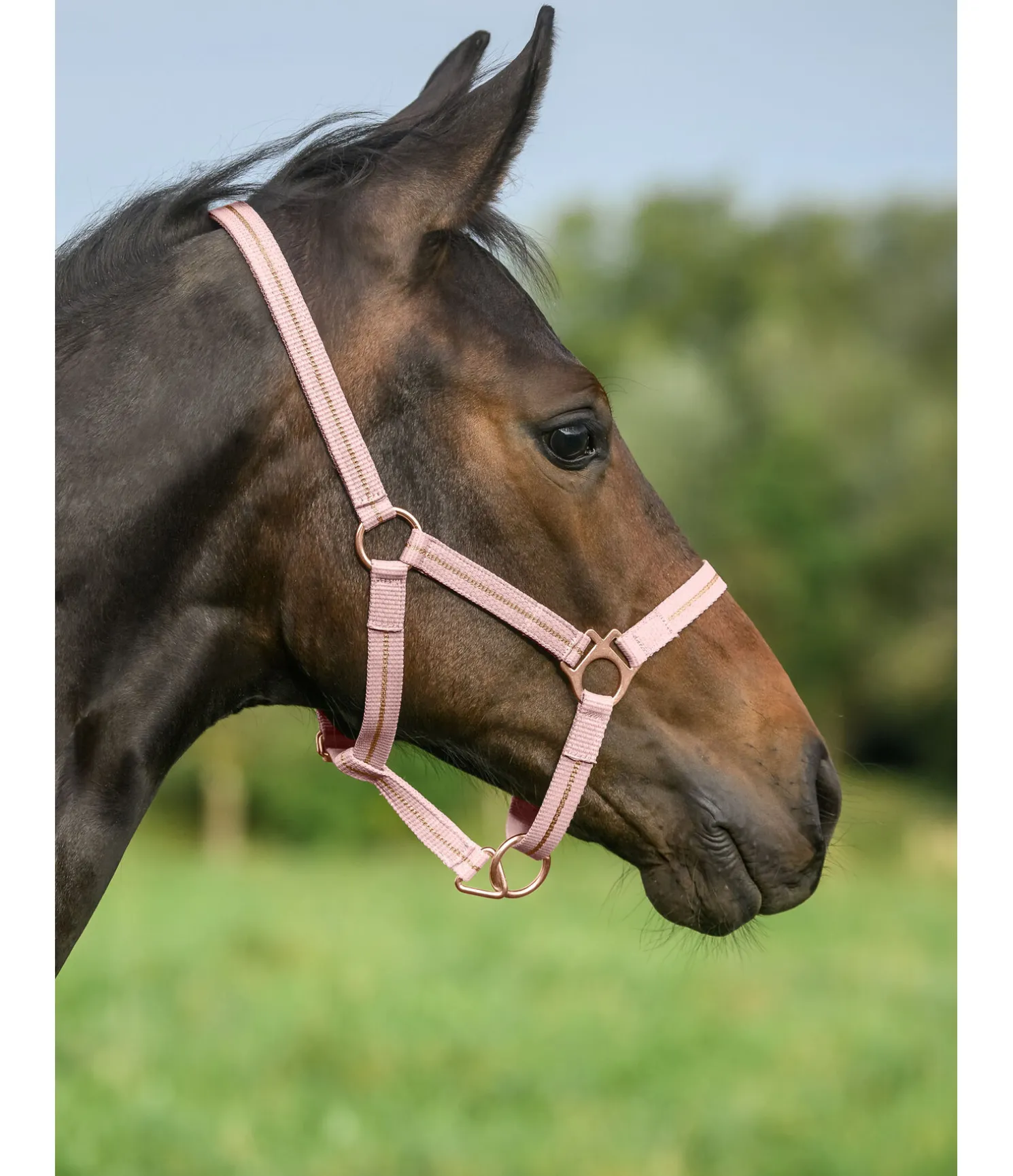 Licol tendance avec fil métallisé scintillant et bouclerie assortie. Têtière, muserolle et sous-gorge réglables en continu. 100 % polypropylène.