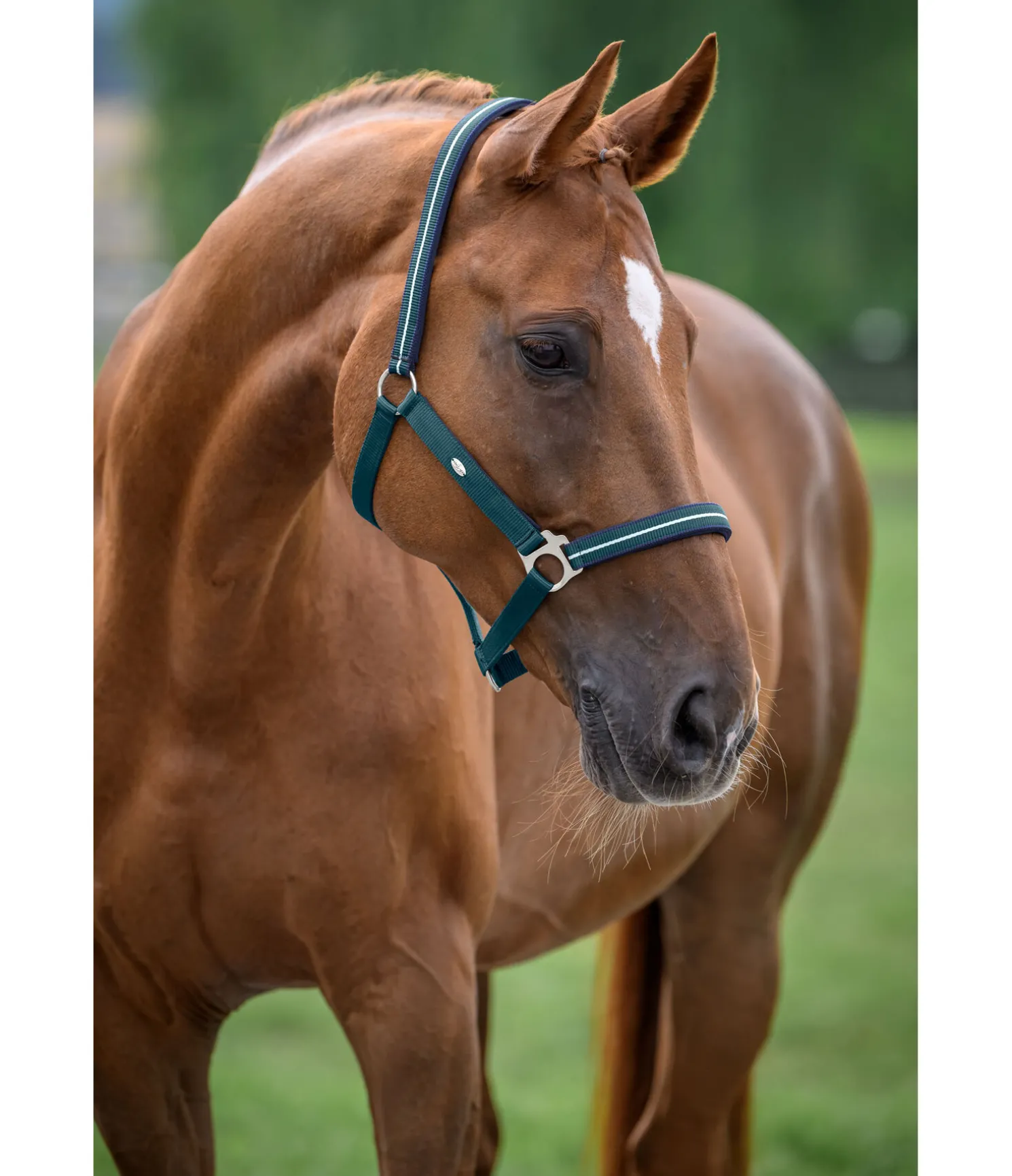 Licol avec rayure discrète. Doublure douce en caoutchouc chloroprène à la têtière, à la muserolle et aux montants pour un confort optimal. Plaque métallique argentée filigrane avec gravure logo sur les deux montants. Têtière facilement réglable. 100 % polypropylène.