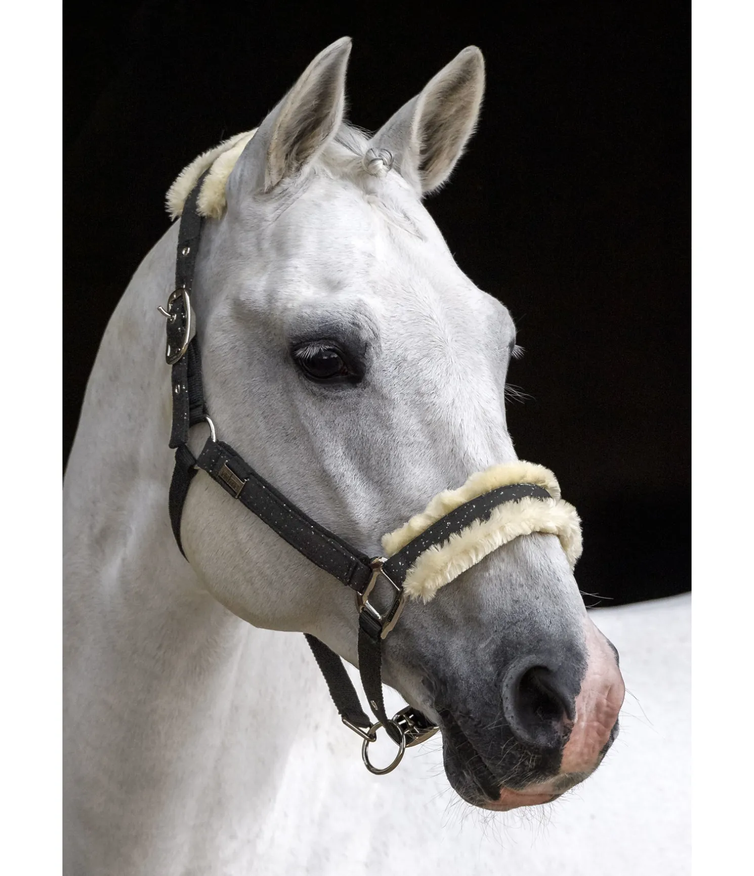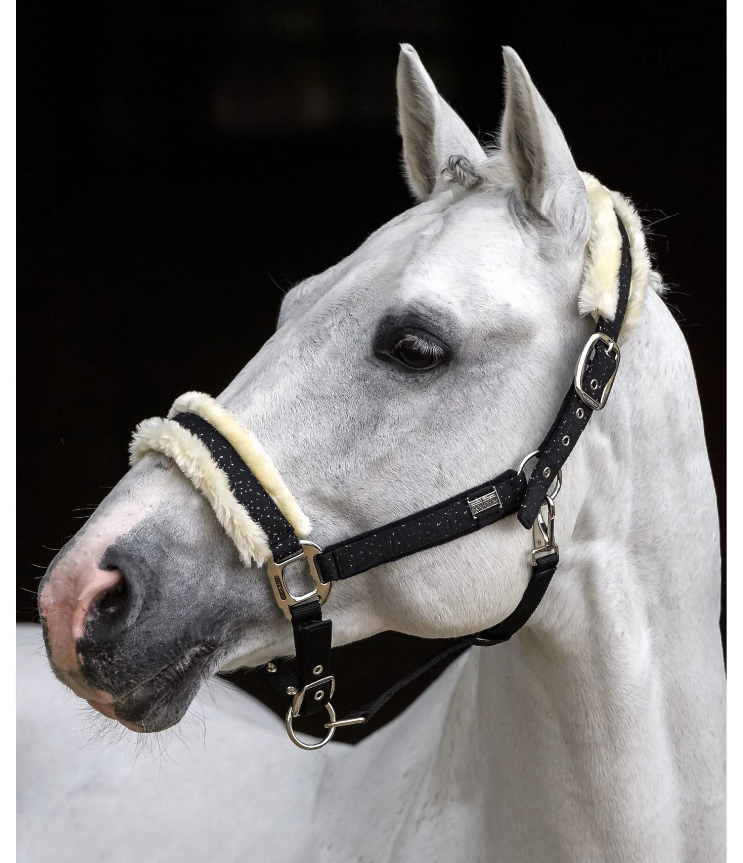 Magnifique licol avec revêtement satiné orné de fragments scintillants et bouclerie de couleur assortie. Têtière et muserolle avec doublure douce en polaire Teddy. Petite plaque élégante avec logo gravé sur chaque montant. Têtière doublement réglable et muserolle réglable. Licol 100 % polypropylène, doublure et revêtement 100 % polyester.