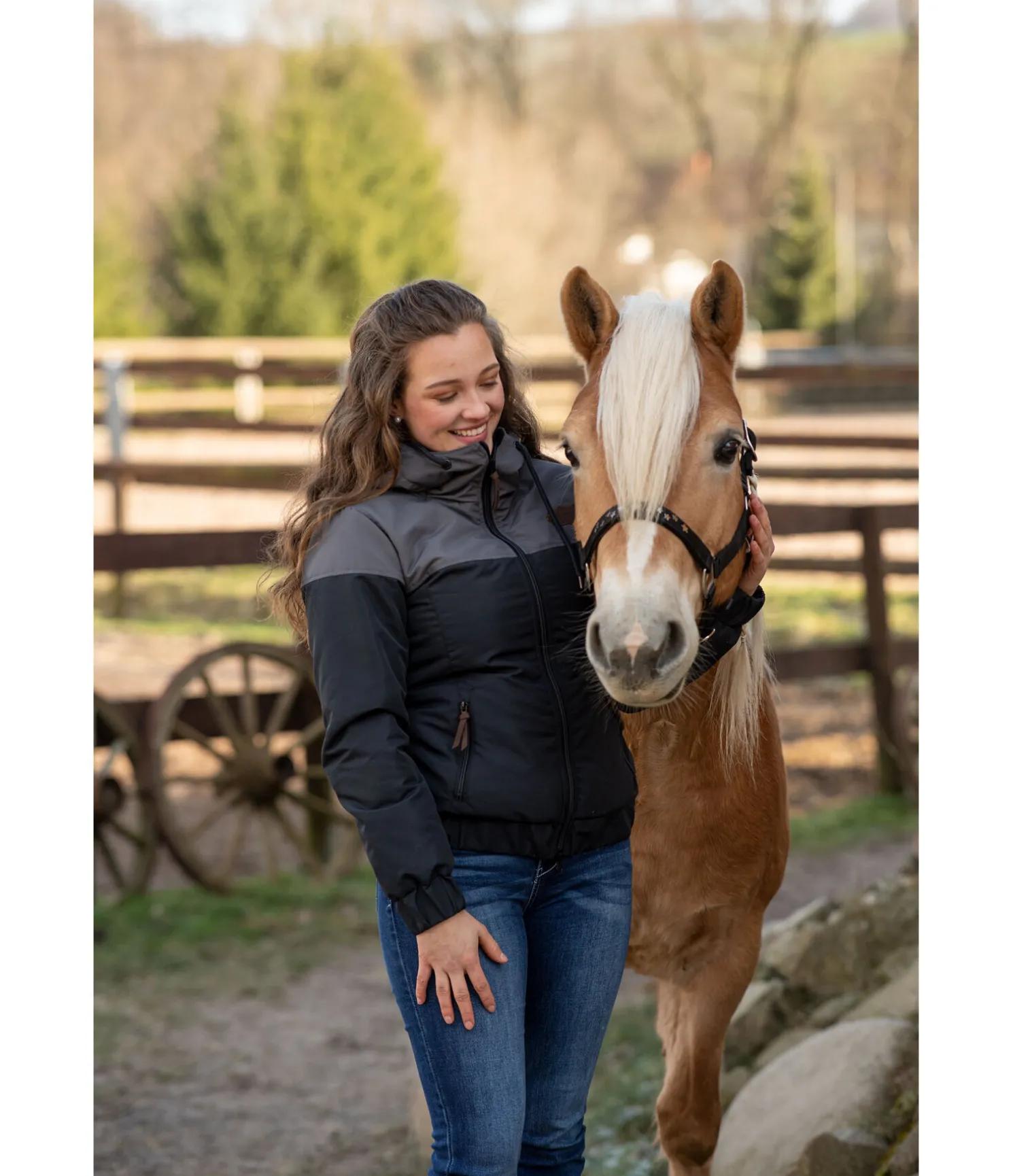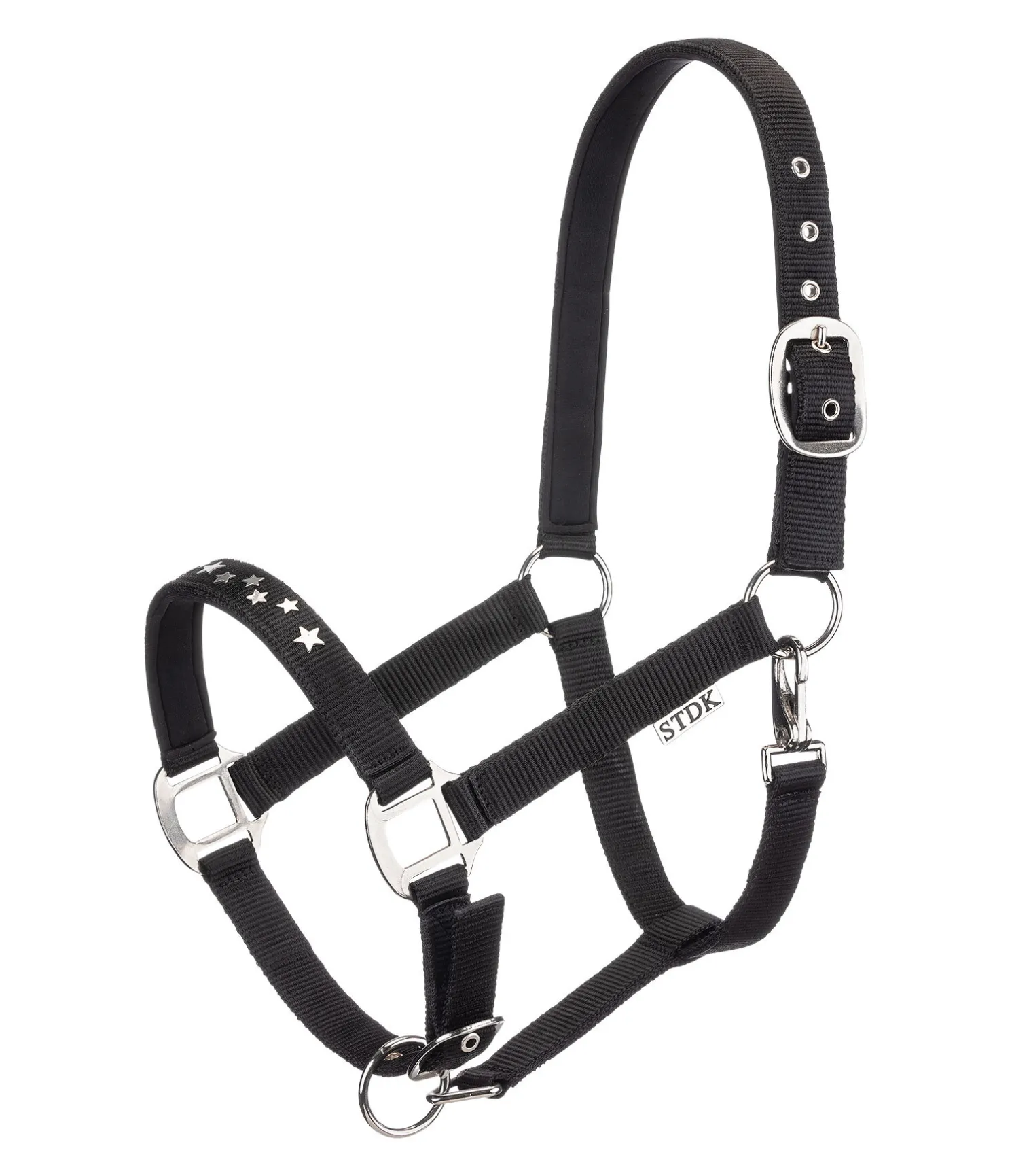 Licol orné de petites étoiles en métal sur la muserolle. Doublure douce en caoutchouc chloroprène sur la têtière et la muserolle. Têtière et muserolle réglables.