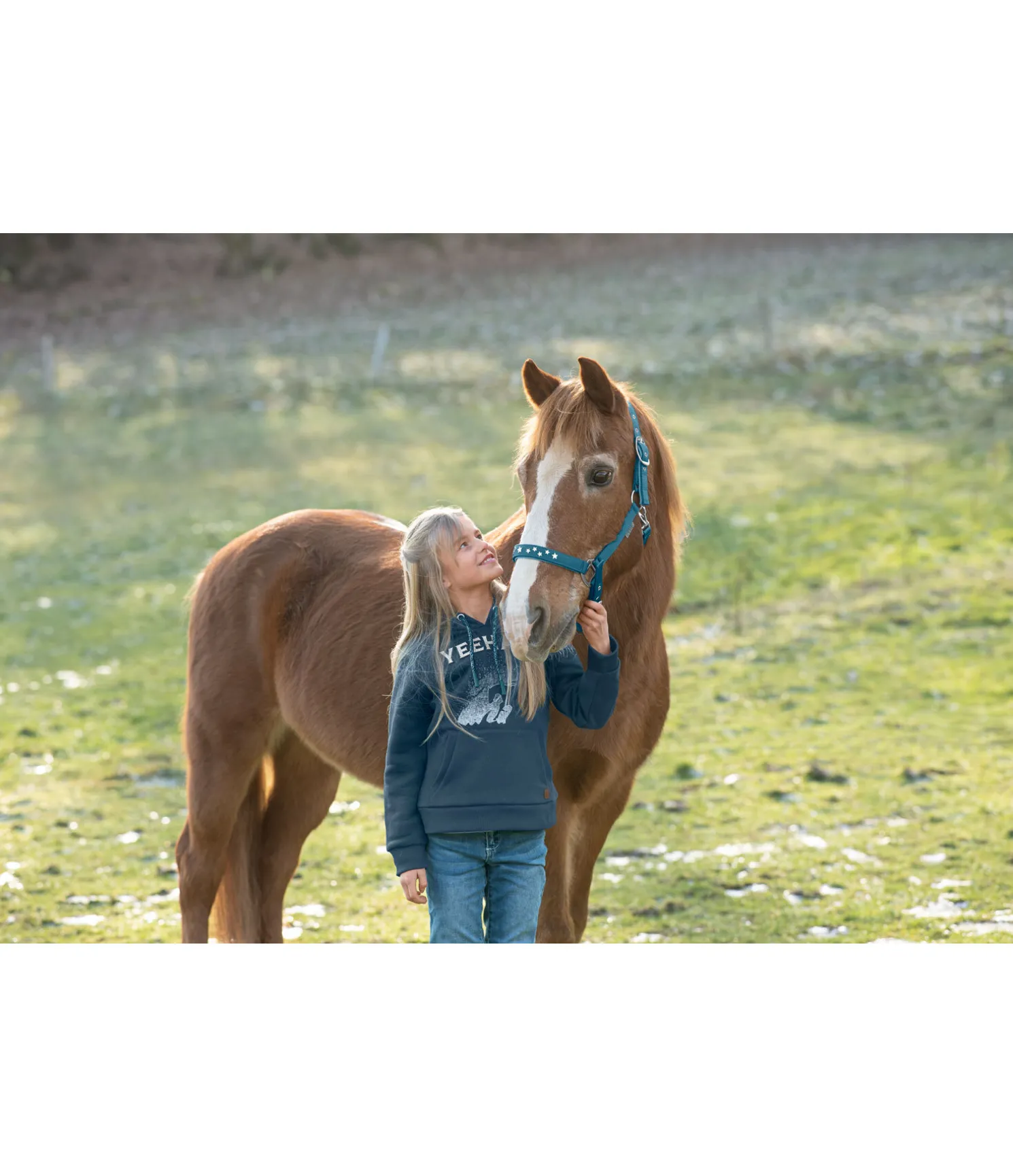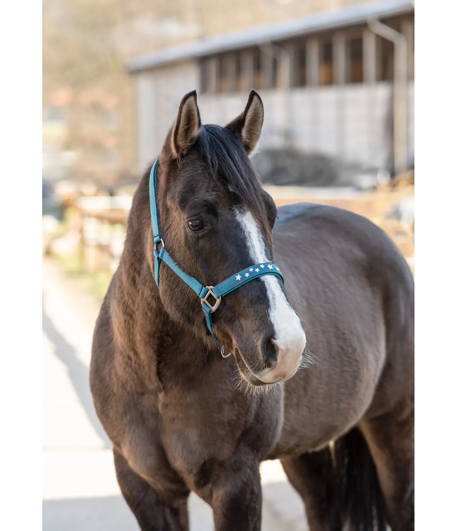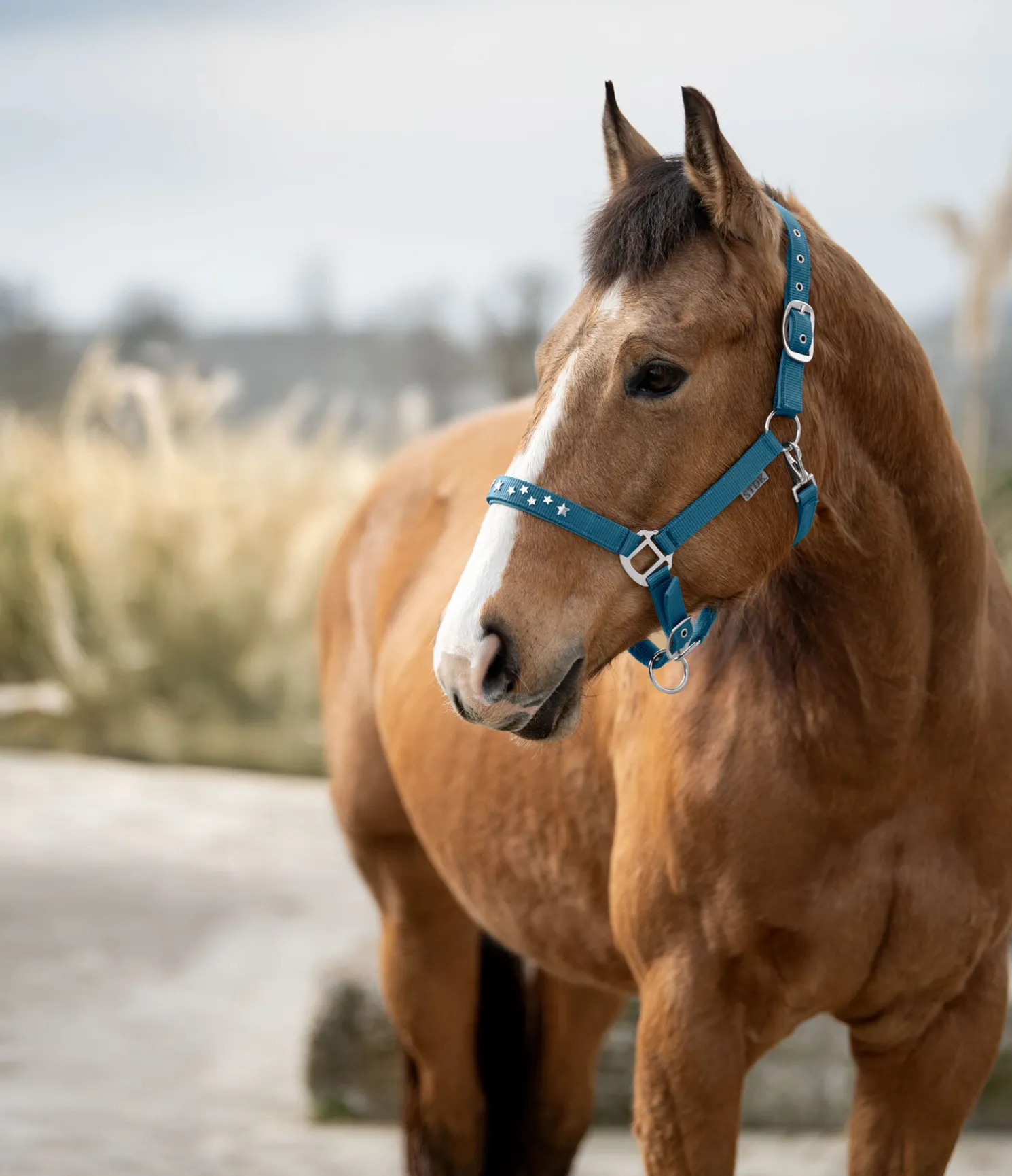 Licol orné de petites étoiles en métal sur la muserolle. Doublure douce en caoutchouc chloroprène sur la têtière et la muserolle. Têtière et muserolle réglables.