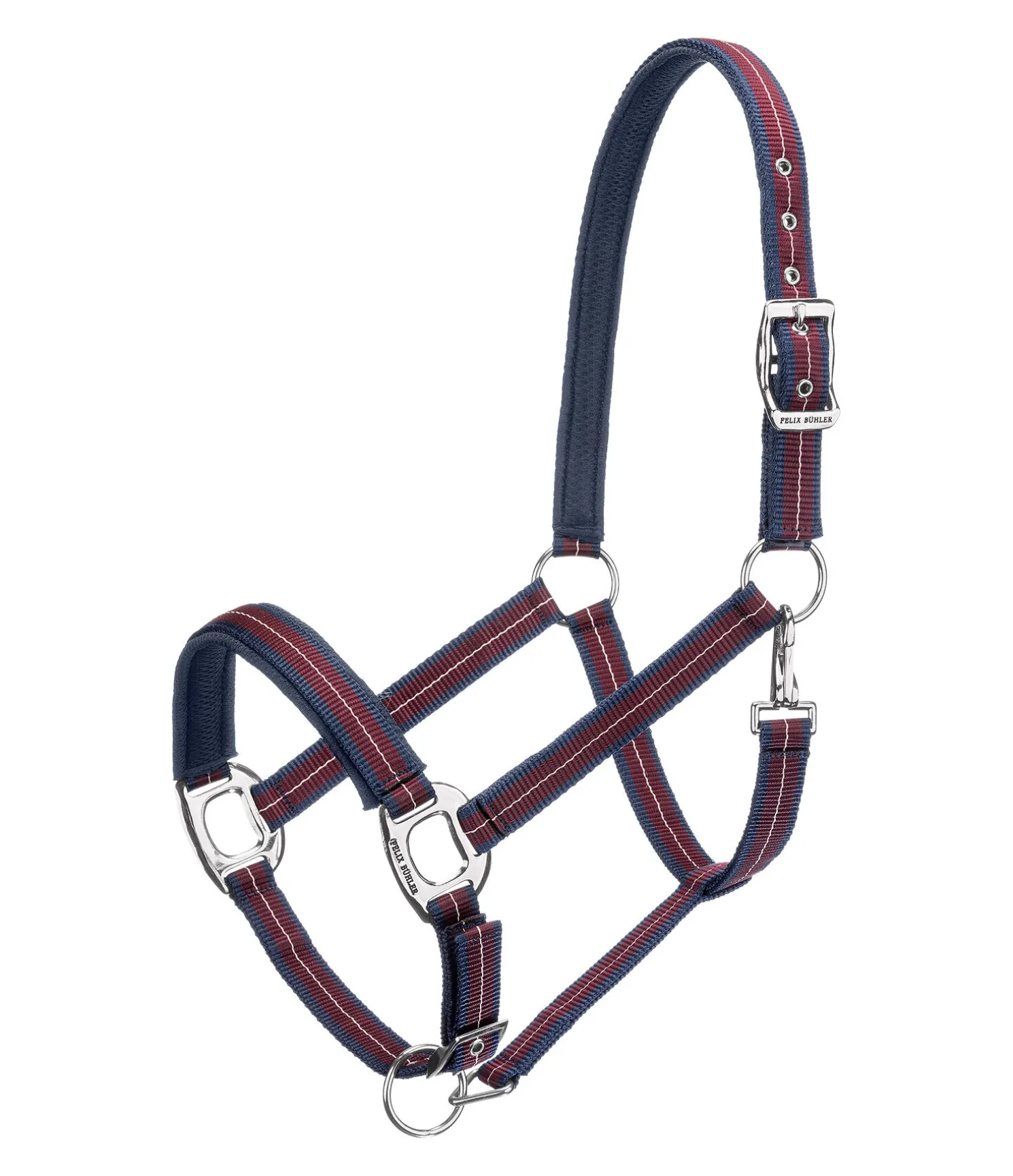 Licol rayé dans un look sportif avec doublure respirante en mesh sur la têtière et la muserolle. Muserolle et têtière réglables. Licol 100 % polypropylène.