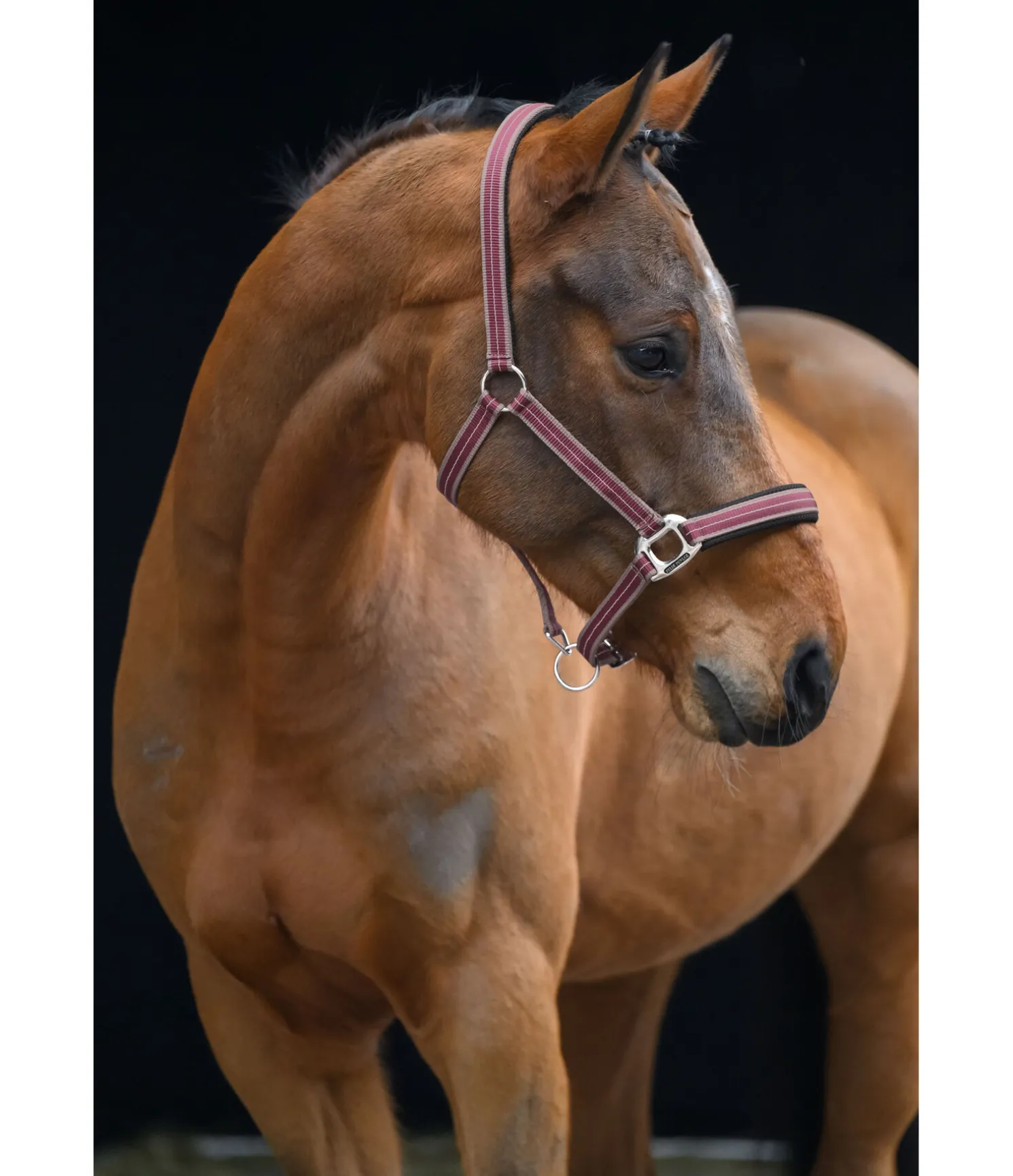 Licol rayé dans un look sportif avec doublure respirante en mesh sur la têtière et la muserolle. Muserolle et têtière réglables. Licol 100 % polypropylène.
