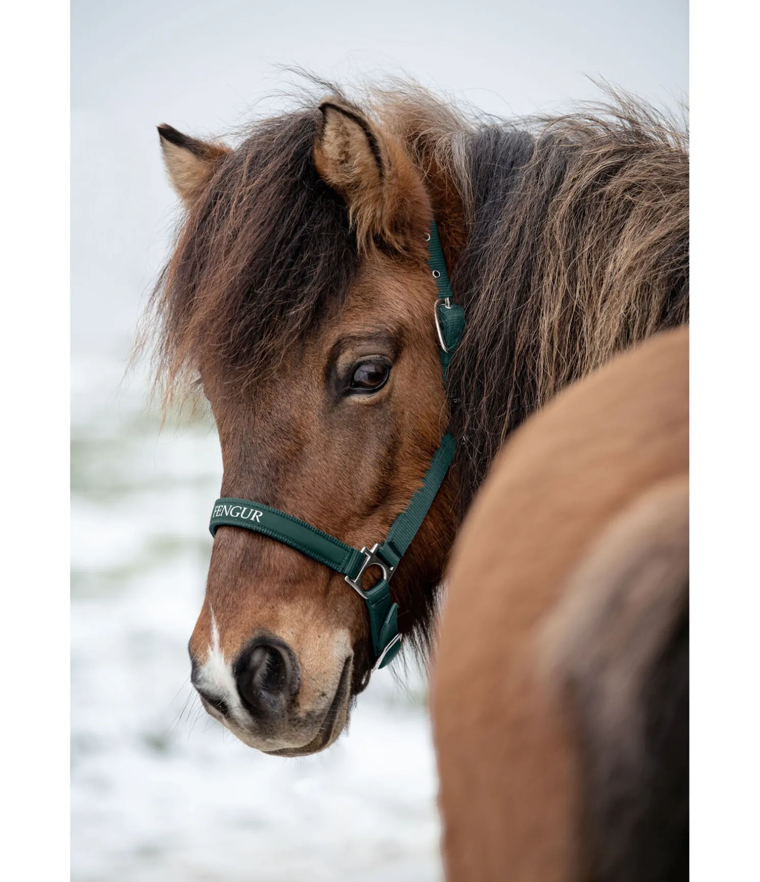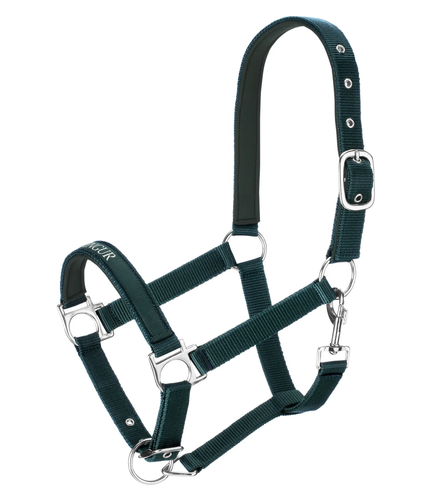 Licol élégant et sportif avec imprimé FENGUR argenté sur la muserolle. Têtière et muserolle avec doublure moelleuse en caoutchouc-chloroprène, réglables pour un ajustement optimal. Bouclerie argentée. 100 % polypropylène.