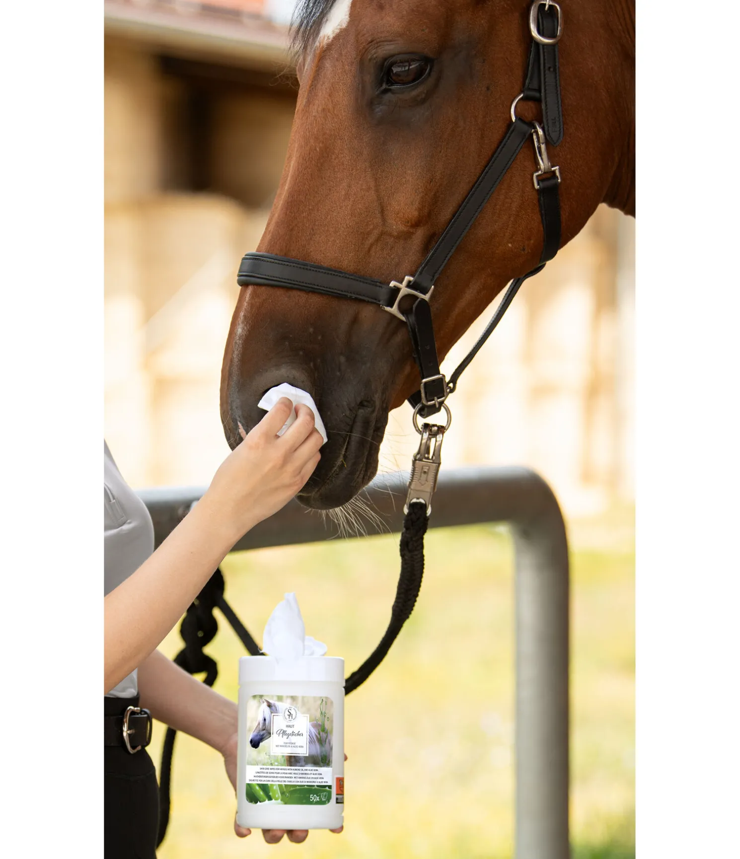 Distributeur de lingettes de soin. Résistantes et extra douces, elles permettent de nettoyer et soigner la peau du cheval, par exemple, au niveau des yeux, des naseaux et des parties intimes. Les lingettes de soin pour la peau sont imprégnées d’une recette douce à base d’aloe vera, d’huile d’amande et d’huile de jojoba bio et conviennent parfaitement aux chevaux ayant une peau sensible. Idéales pour une utilisation quotidienne, lors des déplacements ou en concours.