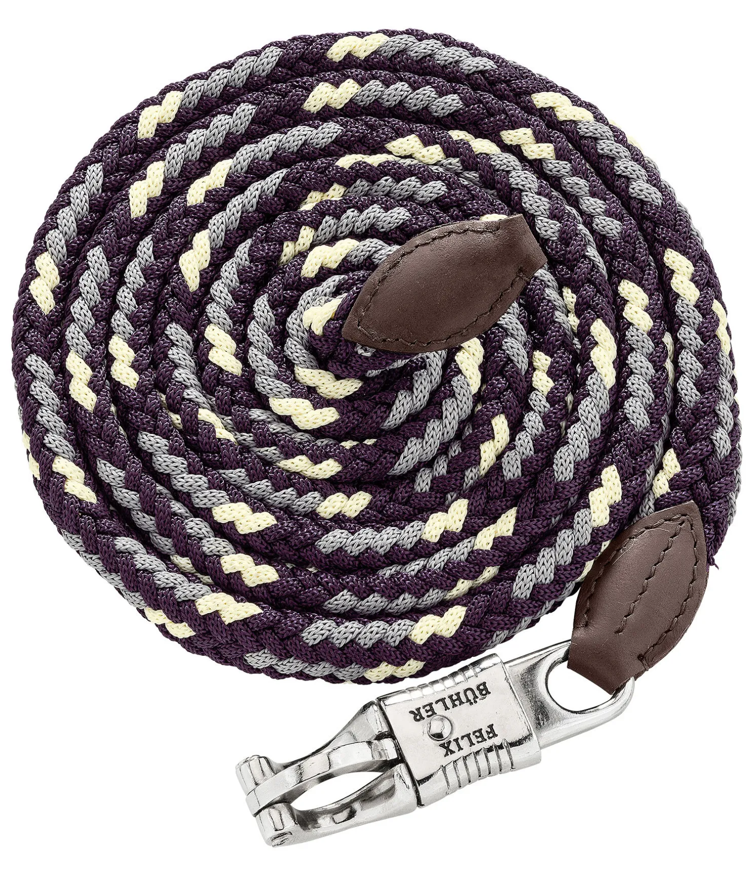 Longe tressée très résistante avec élégants embouts en cuir et mousqueton anti-panique. Assortie au licol 310040. Bouclerie argentée. 2 m. 100 % polypropylène.