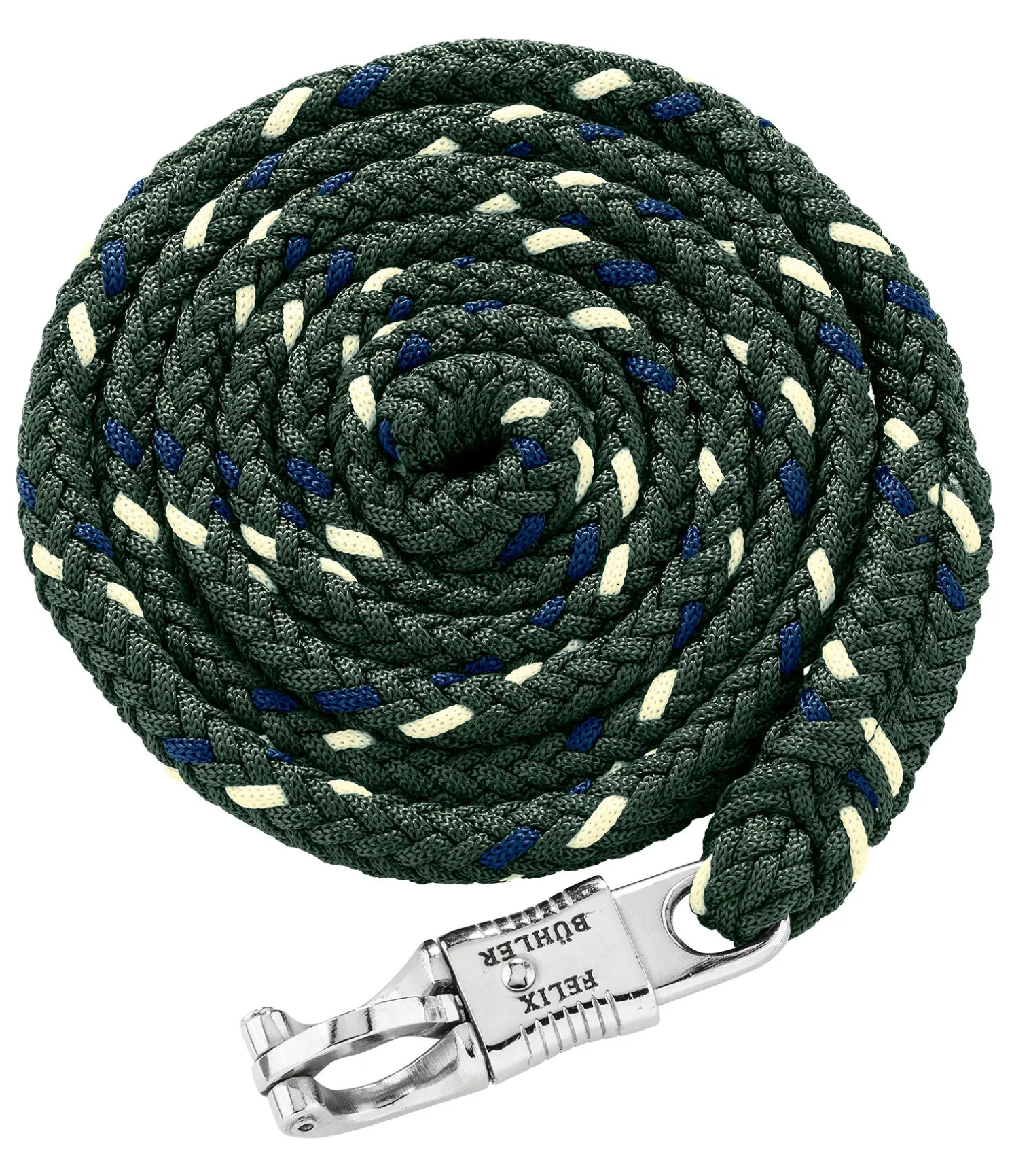 Longe tressée tricolore solide avec mousqueton anti-panique. 2 m. 100 % polyester. Assortie au licol 310057.