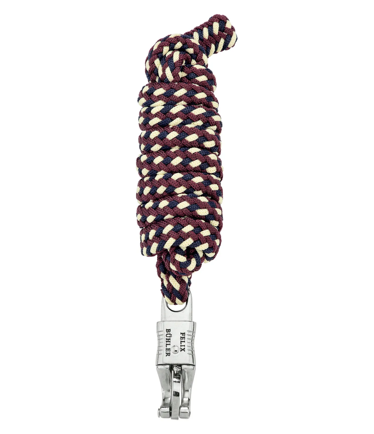 Longe tressée tricolore solide avec mousqueton anti-panique. 2 m. 100 % polyester. Assortie au licol 310056.