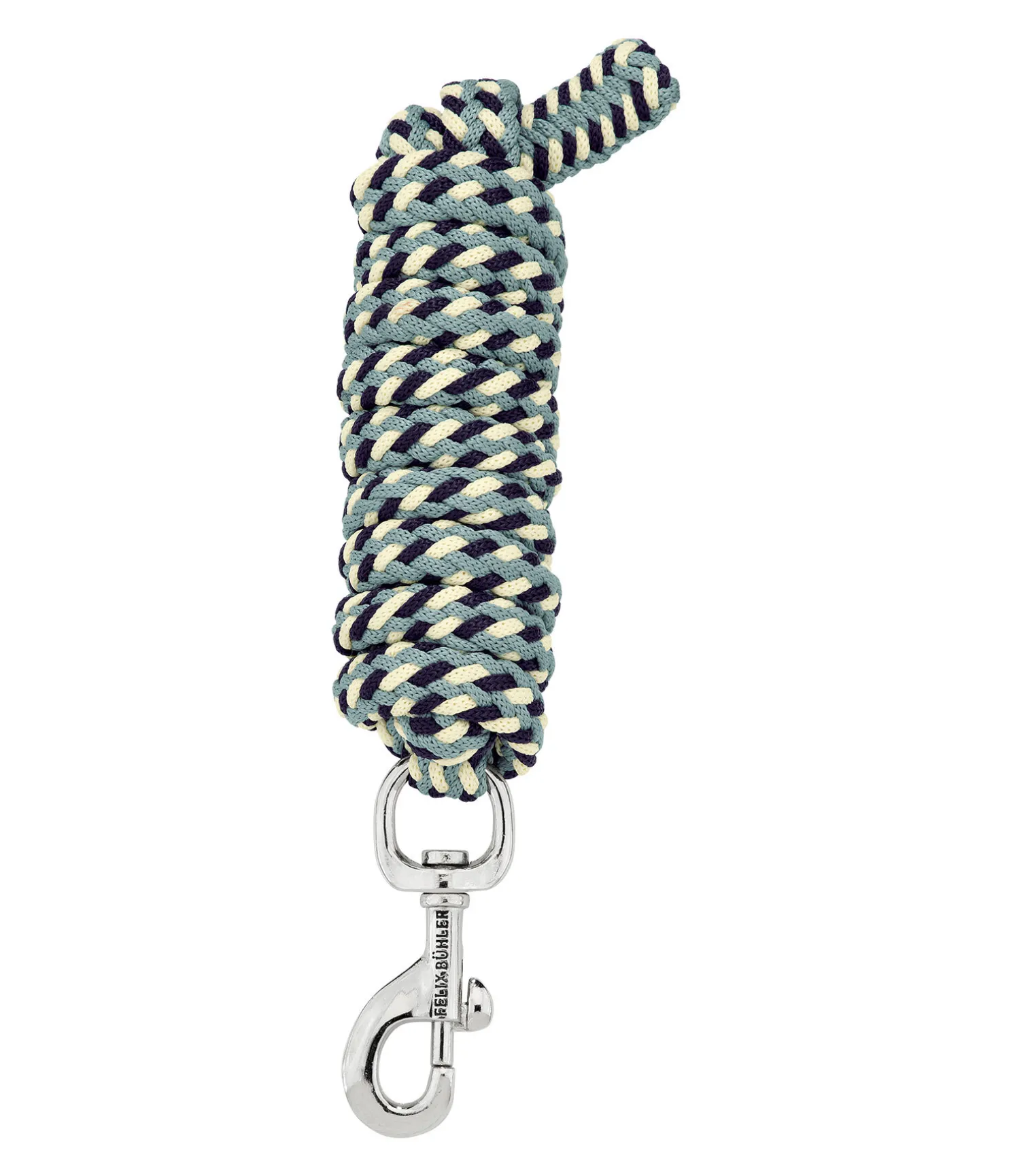 Longe tressée tricolore solide avec mousqueton. 2 m. 100 % polyester. Assortie au licol 310056.