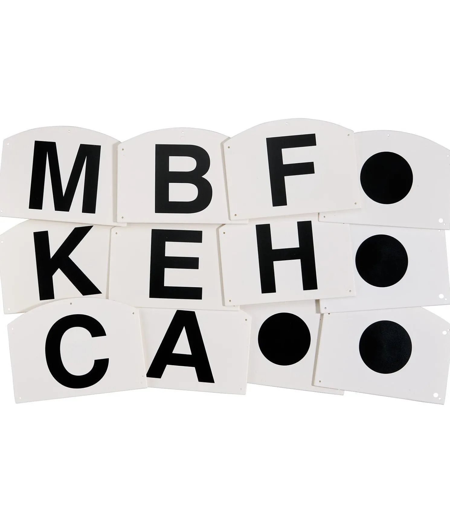 Lot de 12 lettres et repères de dressage en plastique résistant aux intempéries. Plastique blanc, prépercé. Impression noire des lettres A, B, C, E, F, H, K, M + 4 plaquettes avec un gros point noir. 27 x 19,5 cm.
