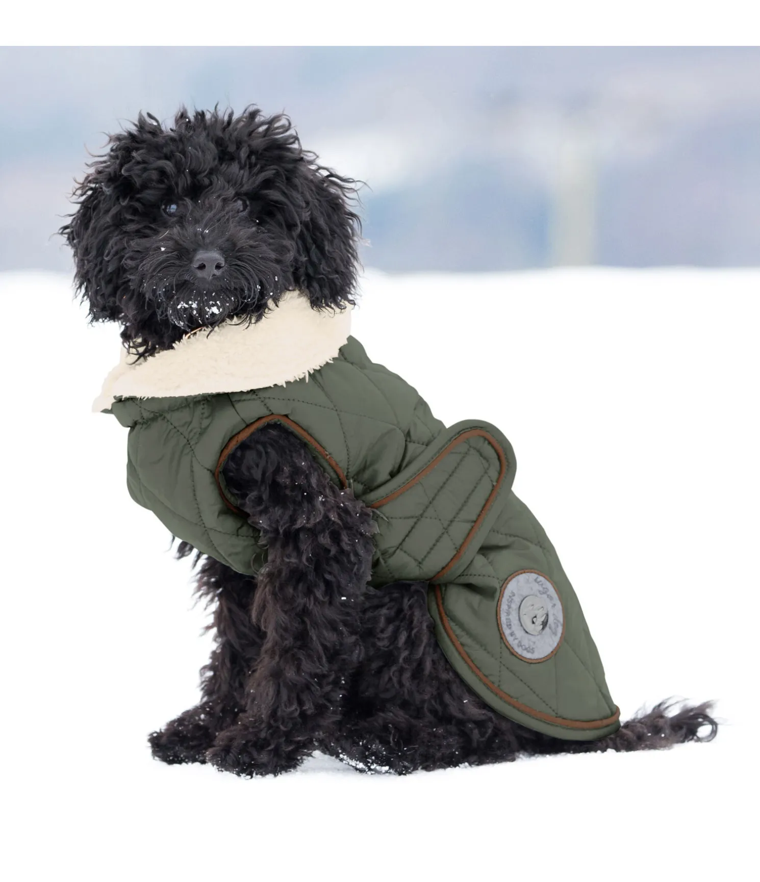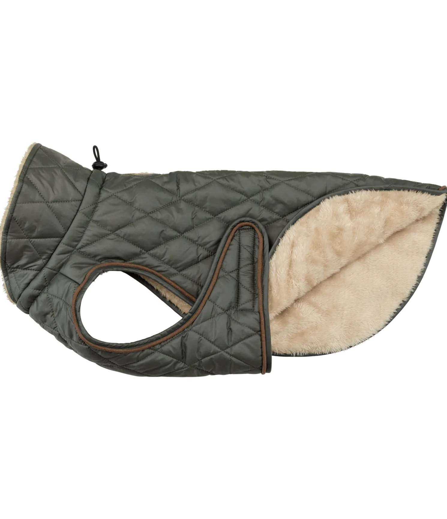 Manteau matelassé tendance avec doublure en polaire Teddy douce et chaude avec un col et garnissage léger 160 g. Tour de cou réglable. Fermeture par patte auto-agrippante au poitrail et sous le ventre pour une mise en place facile. Avec ouverture dorsale pour passer la laisse. Jolis éléments en synthétique et coussinet en métal sur un badge en feutre. Extérieur 100 % nylon (210 deniers), doublure 100 % polyester.