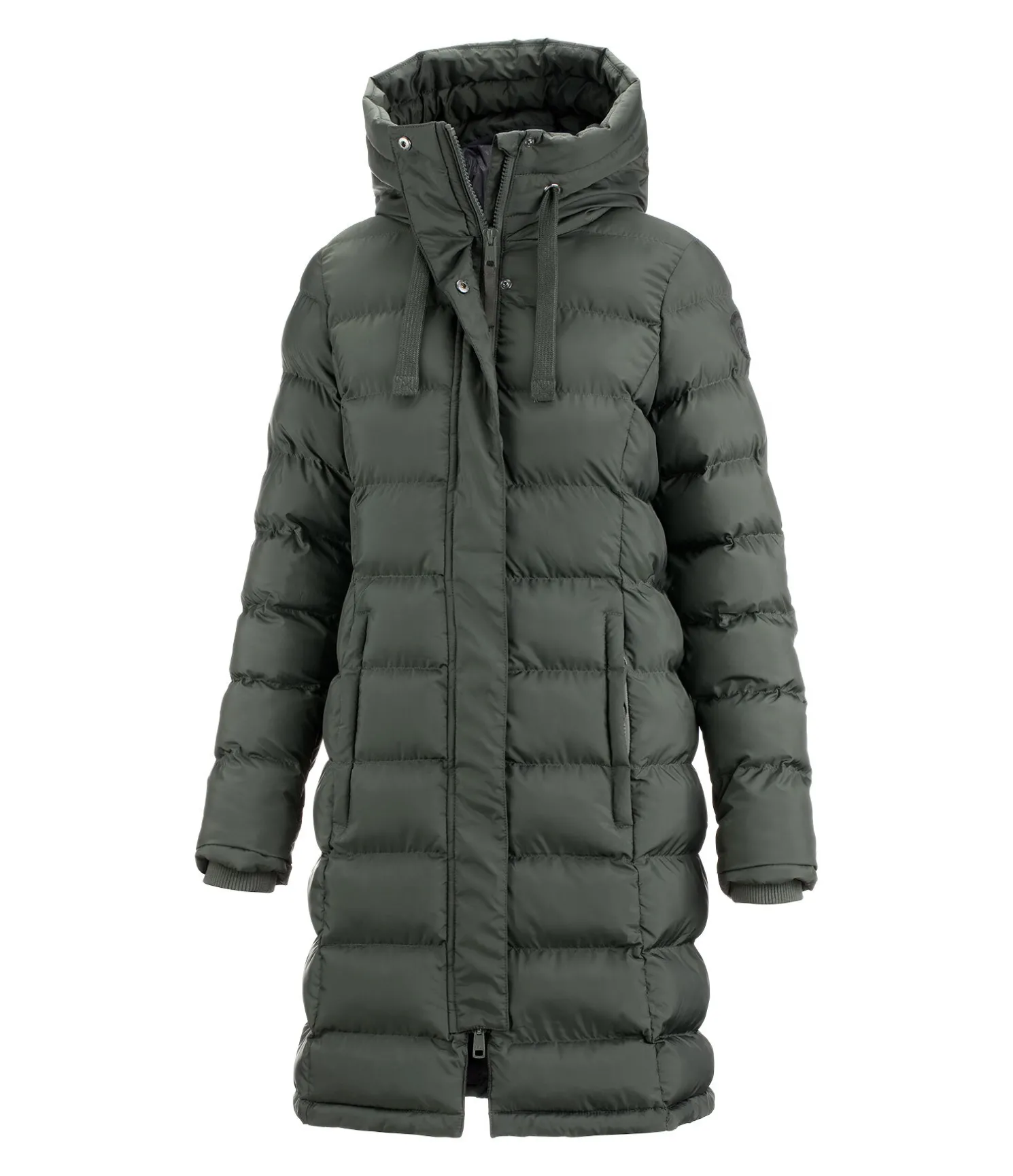 Manteau tendance long et extra chaud. Garnissage doux imitation duvet. Col montant. Capuche réglable avec système d’attache dans le dos. Fermeture à glissière double sens dissimulée. Deux poches latérales zippées dissimulées et doublées de polaire douce. Finition bord-côte en bas des manches. Longue fente cavalière zippée à l’arrière. Broderie Felix Bühler sur la manche. 100 % polyester.